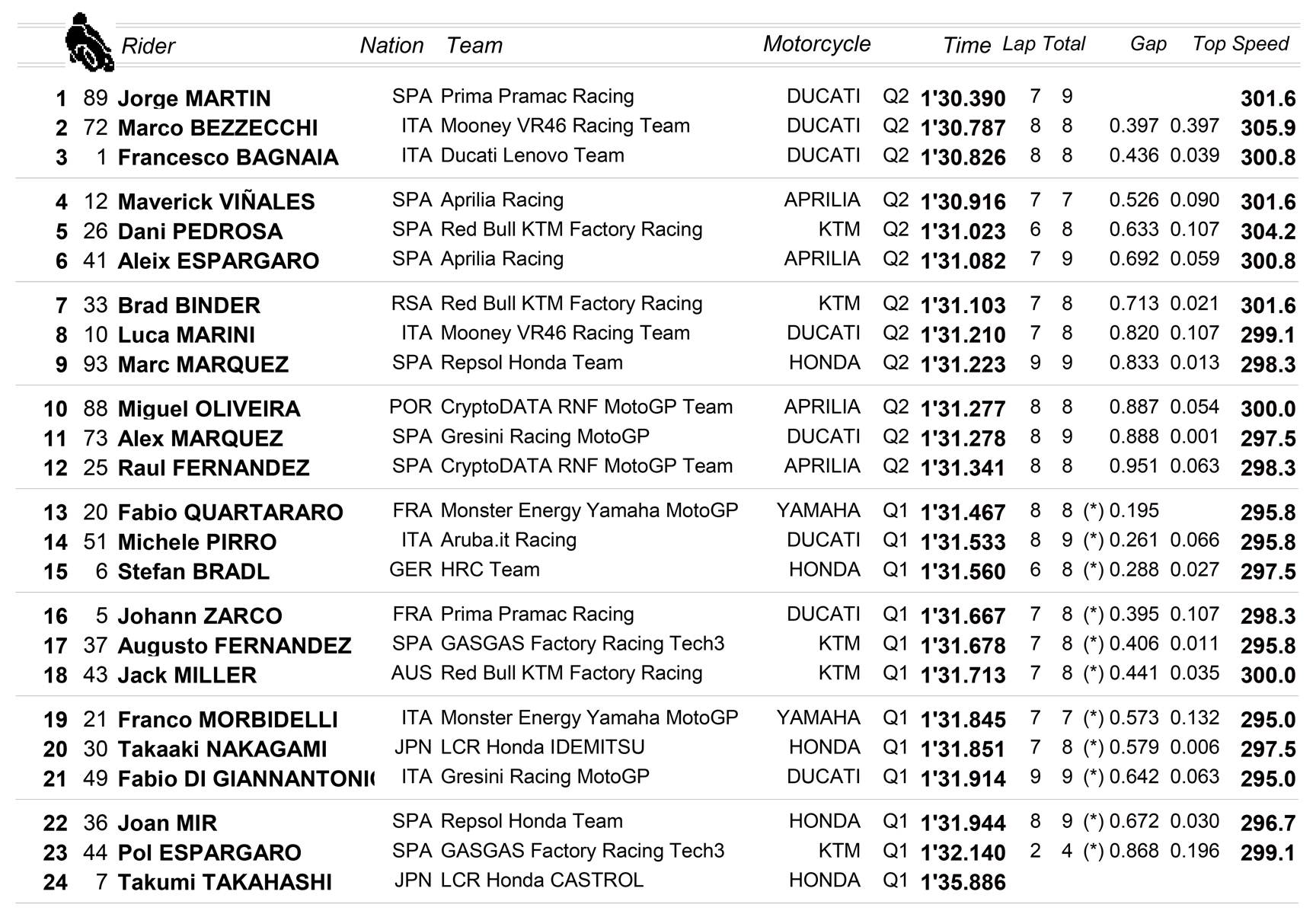 En la siguiente tanda, y teniendo algo lejos la referencia de Dani Pedrosa, Jorge Martín se sacó de la manga una vuelta increíble: 1:30.390 para llevarse la primera pole del año con total autoridad. Bezzecchi y Bagnaia intentaron ser profetas en su tierra, pero no pudieron con Martín y se quedaron a cuatro décimas de su tiempo. Destacable la primera fila de Bagnaia sólo seis días después del accidente de Montmeló.