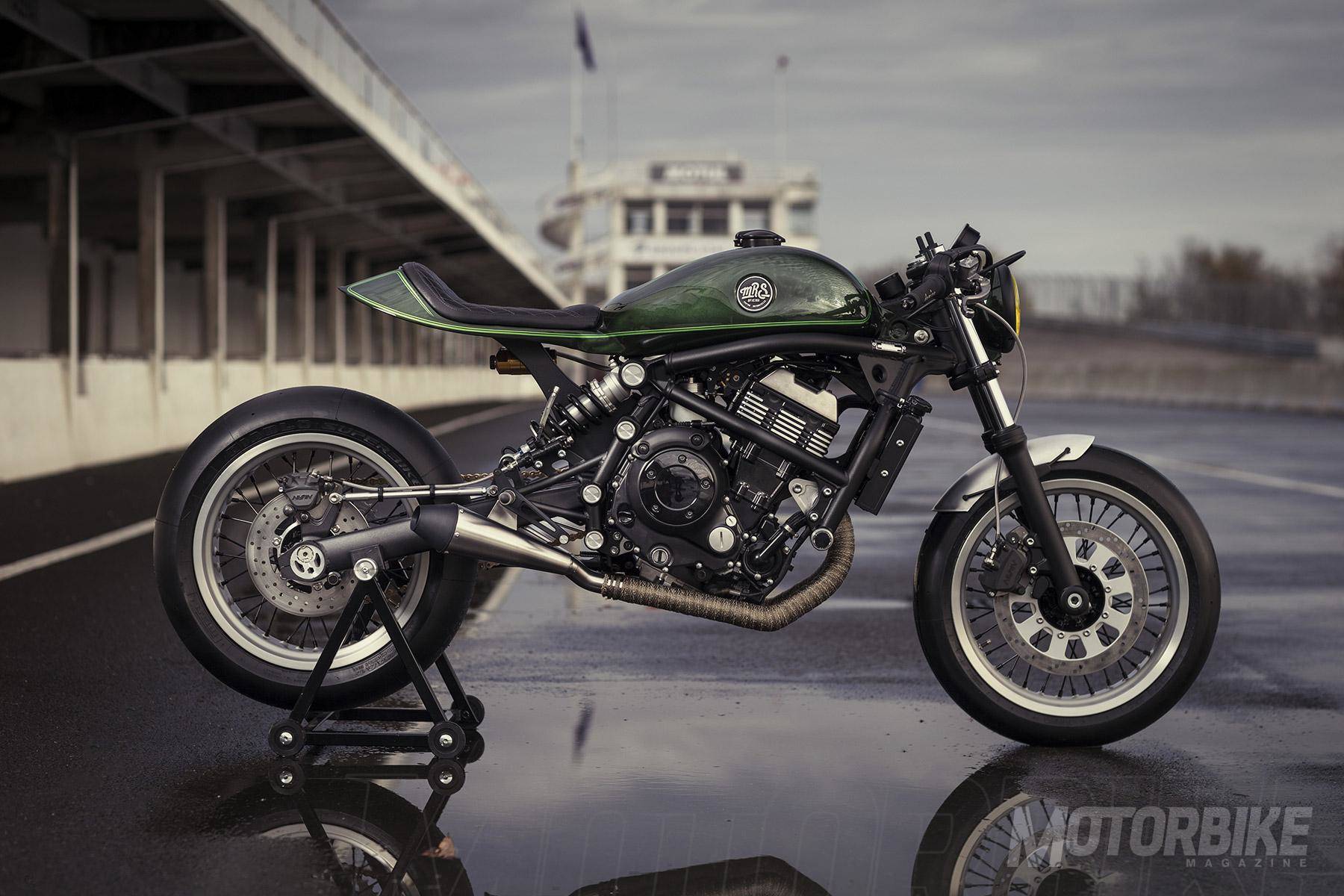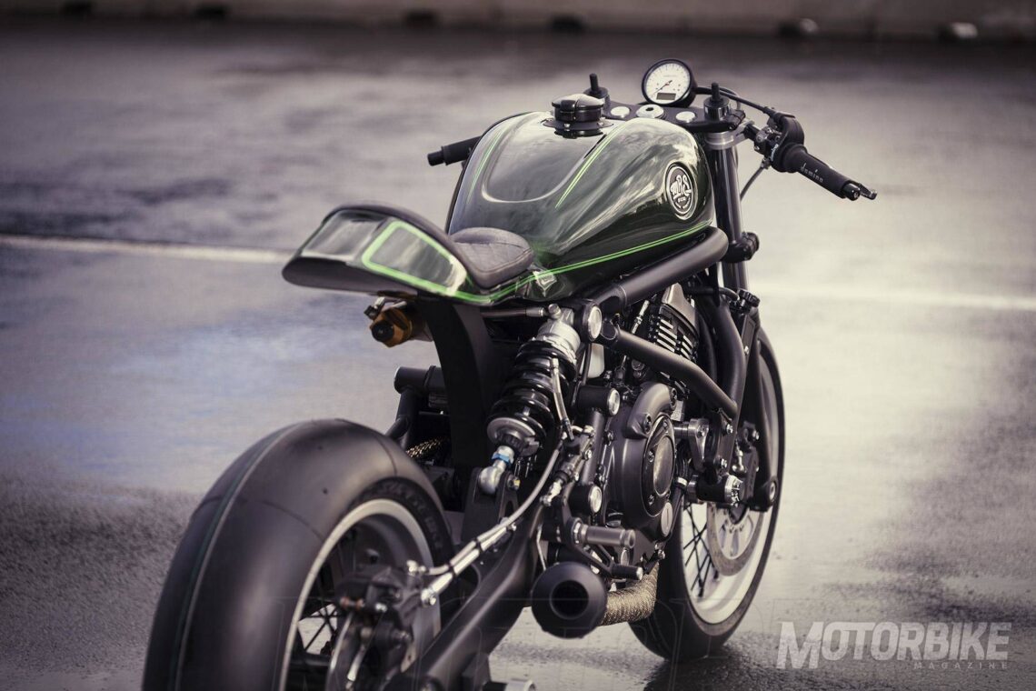 Después de cuatro meses de desarrollo, el preparador francés consiguió literalmente dar un vuelco al concepto que tenemos de esta montura de estilo cruiser, convirtiéndola en una auténtica y exclusiva Cafe Racer.