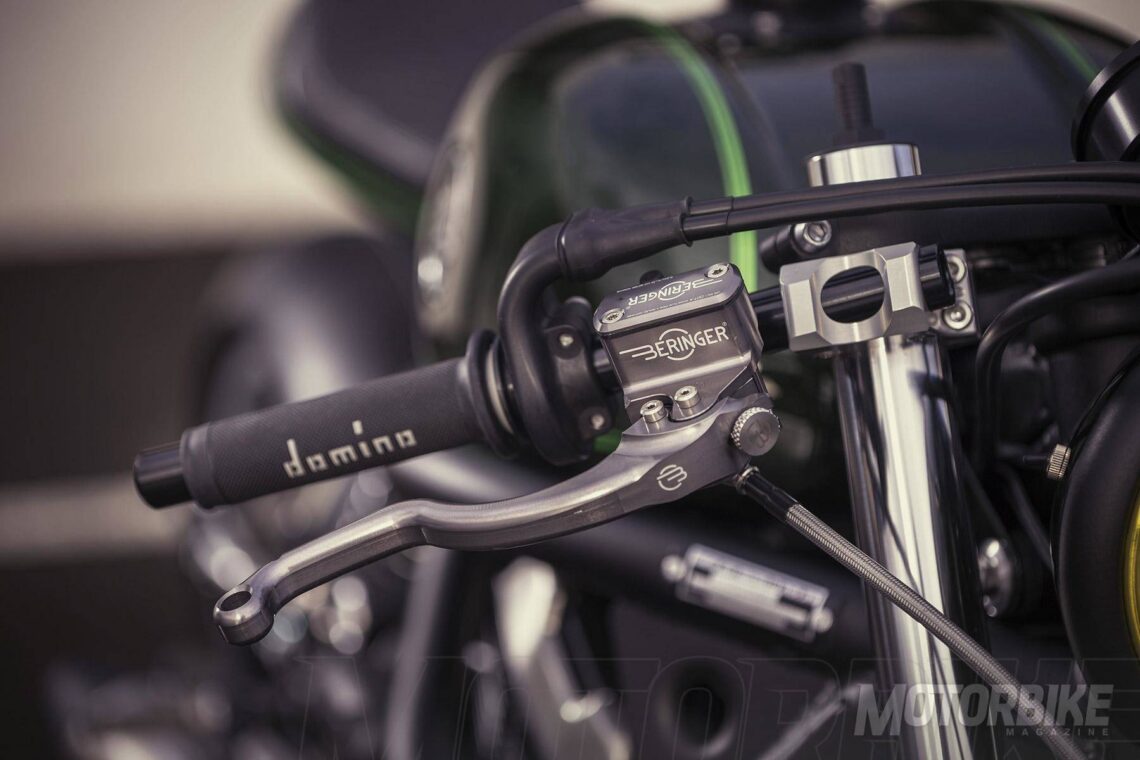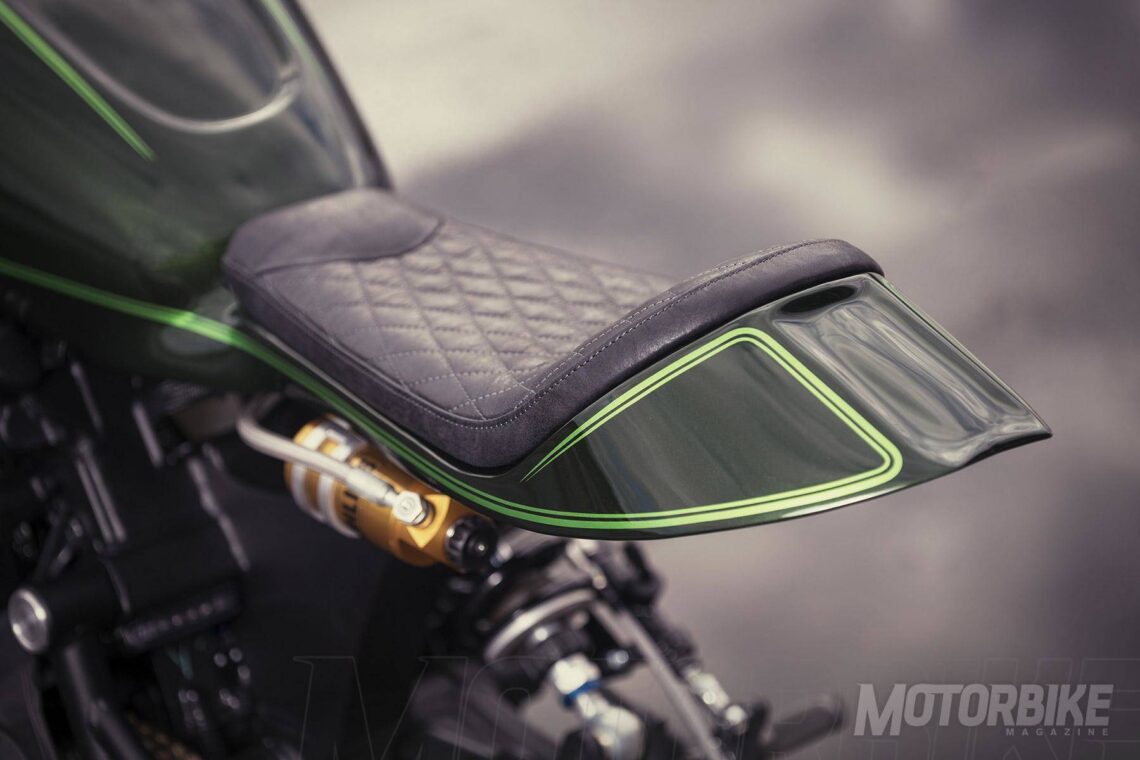 Destaca también un velocímetro y un tacómetro firmados por Motogadget, que han sido instalados perpendicularmente por ambos lados de las tijas. Y como guinda, un gran trabajo de pintura –muy estilo “Kawa”– y tapizado muy elegante.