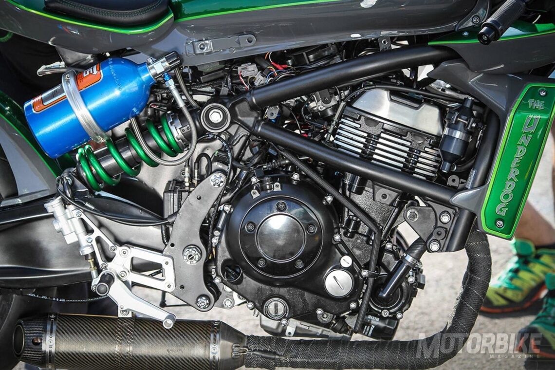 El motor de esta Kawasaki Vulcan S Underdog es lo que más trabajo ha recibido. Briese sabía que la competencia contaría con el doble de cilindrada, por lo que no se podía dejar nada al azar. Había que potenciar los 649 cc al máximo. Para ello se modificó el árbol de levas, se trabajó intensamente las culatas, la distribución y se equilibró el ciüeñal. La relación de compresión se aumentó hasta los 13.5:1 y se instalaron inyectores de Kawasaki Ninja ZX-10R, junto a un sistema de admisión personalizado, colocando dos inyectores por cilindro. Se instaló un sistema Power Commander de ajuste de encendido para adecuarse a los colectores Moto-life.