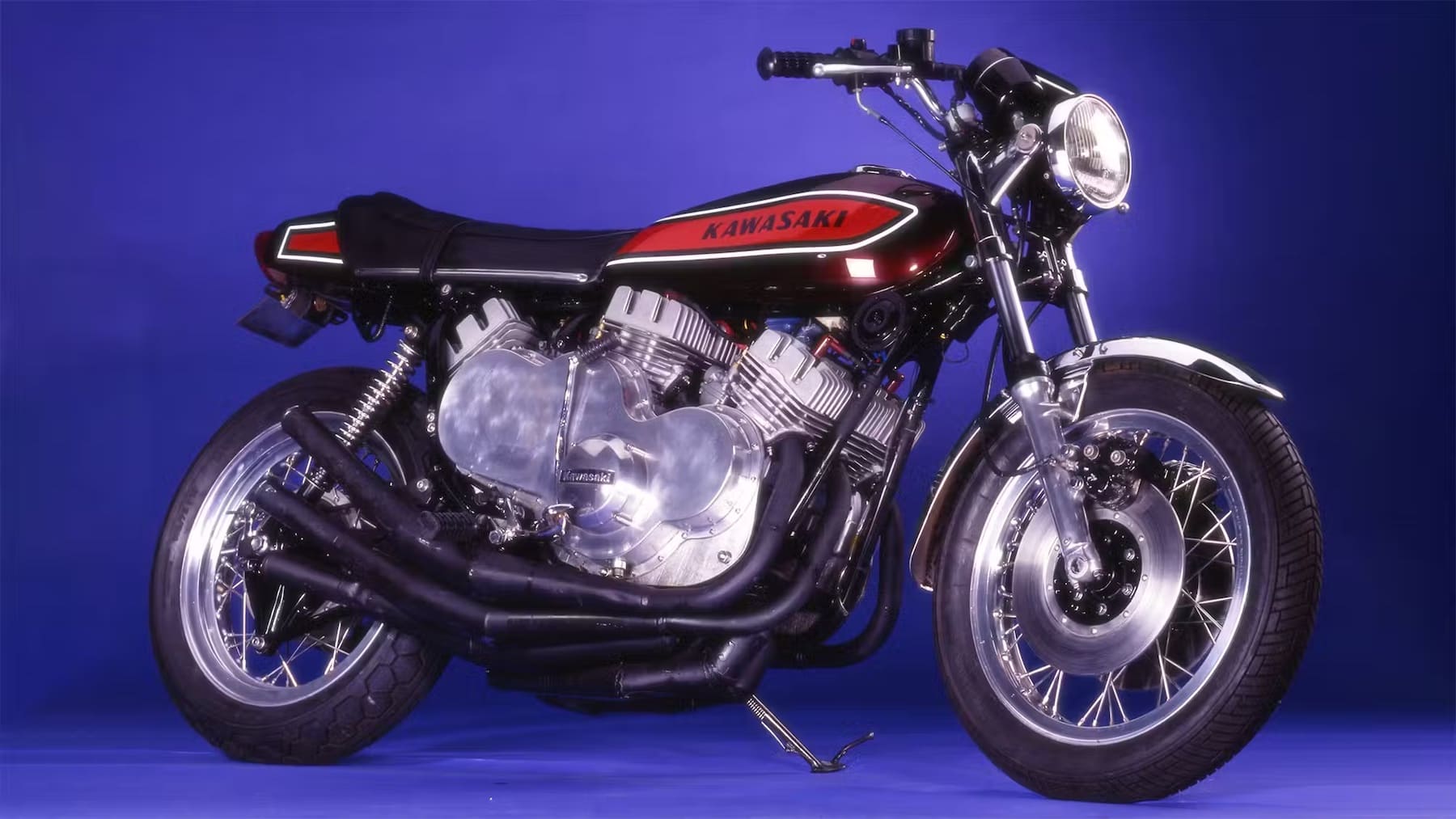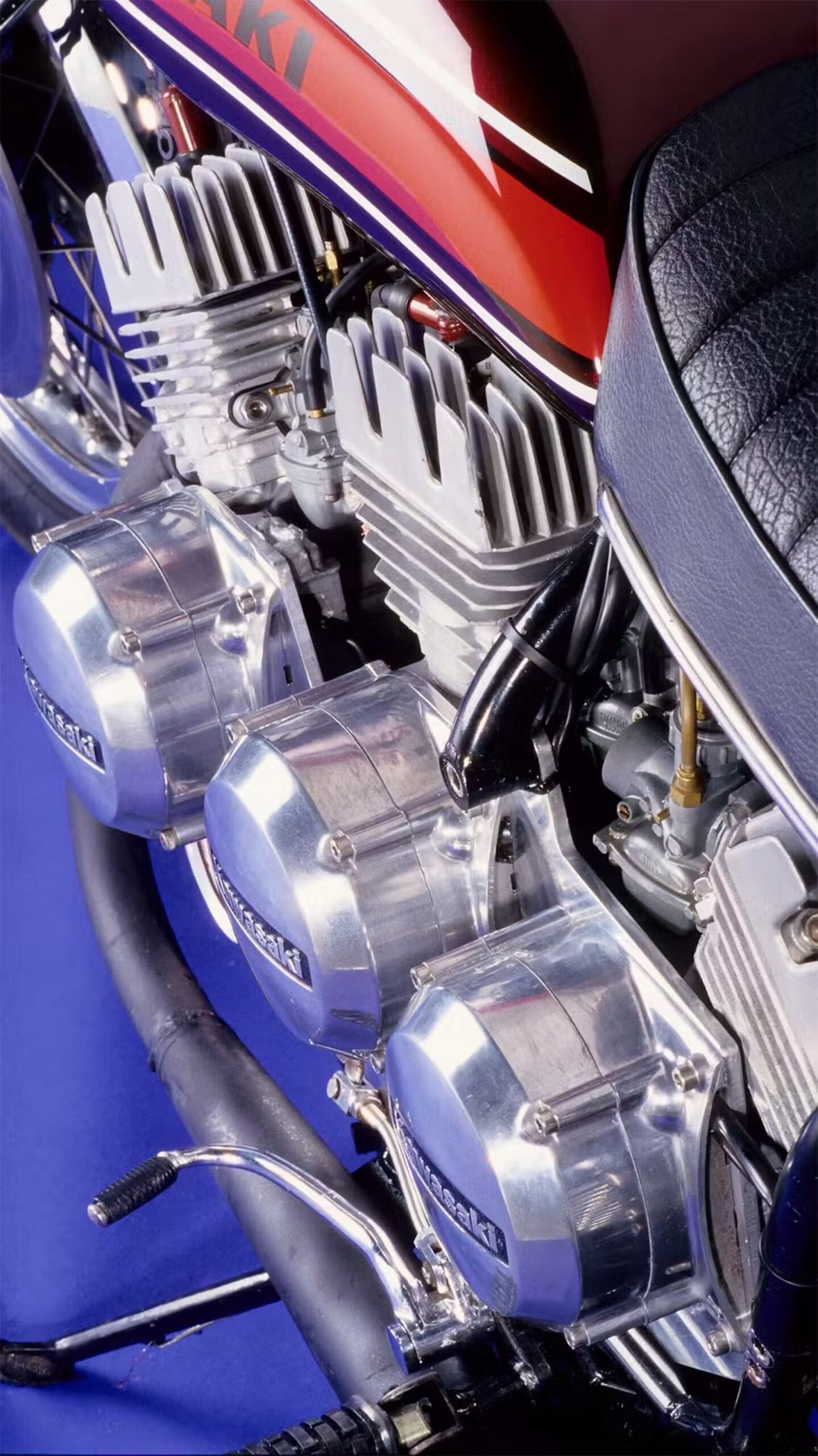 La base del invento son tres motores tricilíndricos de dos tiempos de la Kawasaki KH 250, colocados uno detrás de otro y acoplados entre sí mediante engranajes rectos. En conjunto, el bloque suma unos 750 cc y una potencia estimada por encima de los 75 CV, ya que cada motor original ronda los 26 CV. Para soportar semejante mecánica, Whitelock recurrió al cambio de una KH 500 H1, una de las más salvajes de la época, apodada con razón como “Widowmaker”.