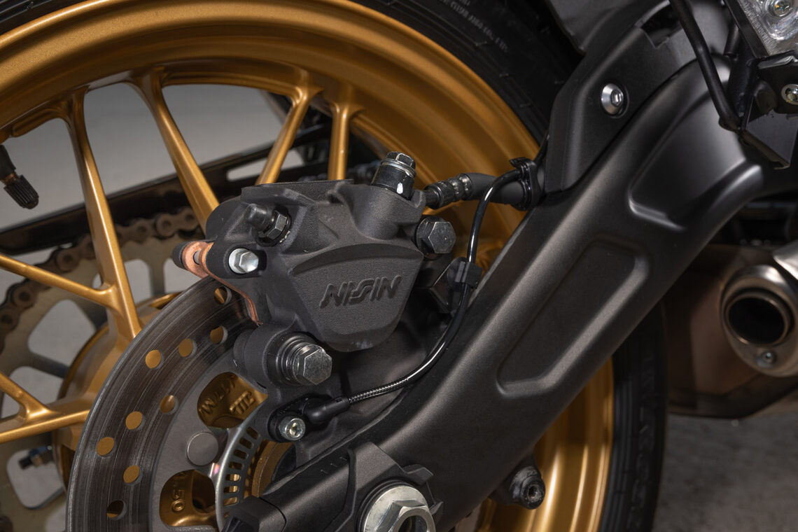 Para el equipo de frenos, es Nissin la encargada de suministrar a la RS de doble pinza axial delante con doble piston y discos circulares de 300 mm con bomba convencional y detrás con una pinza simple de un solo pistón con disco de 220 mm. La frenada es súper contundente. Sorprende mucho el tacto y su reacción.