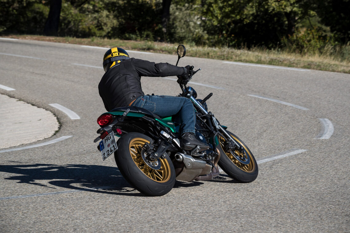 Atravesamos la ciudad de Marsella con bastante trafico, pero una vez en la carretera de curvas enseguida nos dimos cuenta de que esta RS es una auténtica gozada de llevar. Desde el primer momento que plegué en curva, noté que el conjunto es muy muy ágil y tienes la sensación de que la moto hasta “cae” demasiado rápido hacia el interior de las curvas y es que su agilidad es abrumadora. Empezamos a enlazar curvas y nos dimos cuenta de que su chasis es muy noble. Su motor empuja siempre, sean cuales sean sus revoluciones y sin transmitir demasiadas vibraciones. Me sorprendió bastante el funcionamiento de suspensiones y es que pensaba que serían algo blandas para ser este tipo de moto. Tengo que decir que en absoluto, el amortiguador trasero aguanta perfectamente sin dar demasiado hundimiento en las aceleraciones y la horquilla delantera aguanta perfectamente hasta fuertes apuradas de frenada, además de que en paso por curva el conjunto es estable. Vamos, ¡una gozada! Si tengo que hacer hincapié en algún apartado, es en los frenos. No me esperaba una mordedura de frenos tan contundente para una moto de estas características. Me sorprendió lo bien que frena y la poca fatiga que tiene este sistema Nissin. Por último, comentar el funcionamiento del cambio. Sí es cierto que al pasar de punto muerto a primera el cambio es algo tosco, pero una vez en marcha, los cambios son precisos en todo momento y de accionamiento más bien corto.