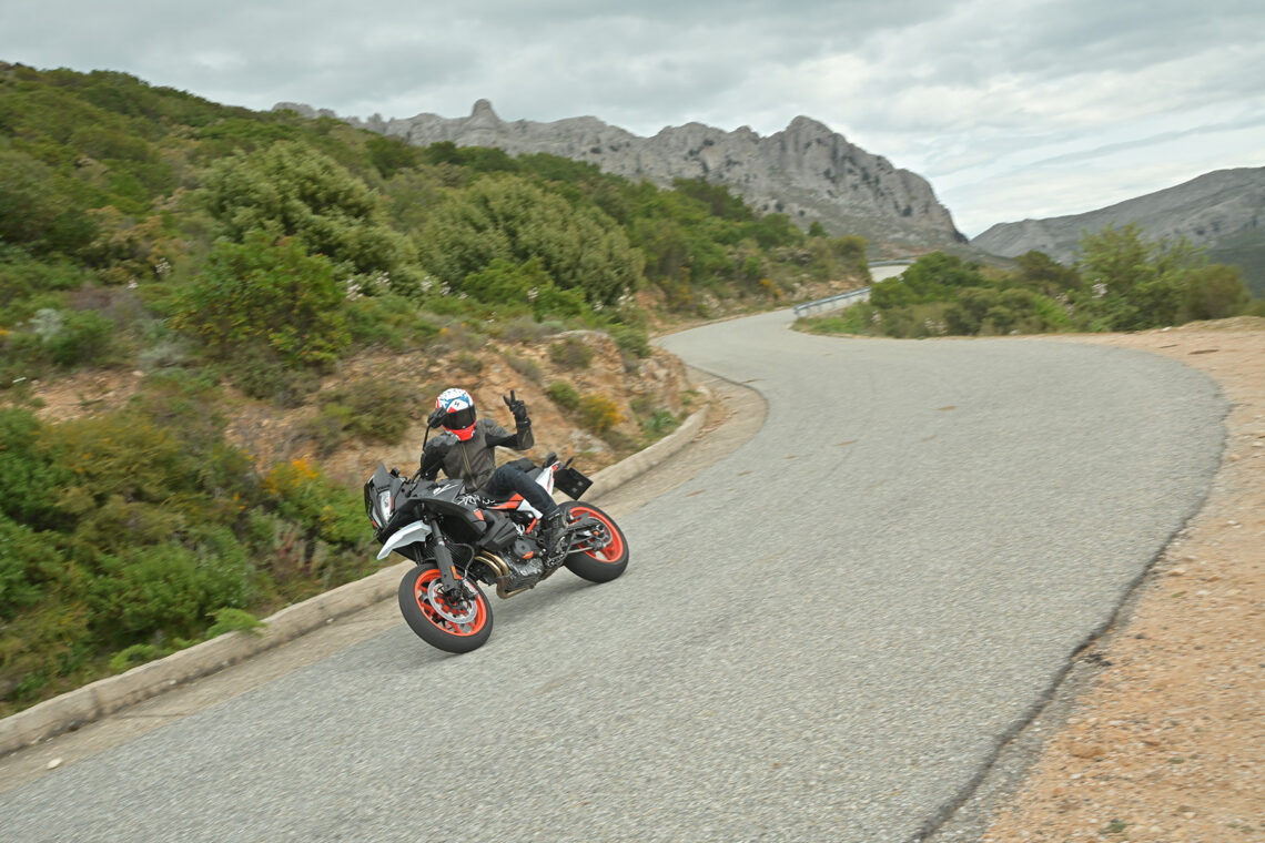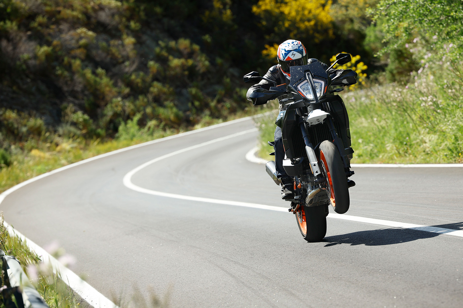 Salimos a carretera, empiezan las curvas, esperas un tiempo prudencial para ir conociéndola, para ir encontrando ese punto de conexión y feeling con ella, y mientras vas pensando en eso, te das cuenta que ya vas rozando estribo en una moto que parte de un chasis y altura de moto trail. Es una moto muy fácil de entender, muy fácil de conectar con ella, y muy fácil de sentirte cómodo a los pocos minutos. Jamás lo diría de una KTM, y mucho menos de una moto cuyo enfoque parece la radicalidad motorizada bajo el estilo supermotard, pero nada nada, su definición sería más acertada como "trail asfáltica", solo que ciertamente cuenta con una envergadura y peso tan reducido que, acepta conducción ágil y nerviosa como una supermoto. Eso es lo que la puede diferenciar de otras "trail asfálticas" que con todo mi respeto, son barriletes varados (debo hacer un inciso, la nueva Tracer 9 GT no entraría en esa definición, otra gran moto por cierto) con neumáticos sin tacto/de asfalto.