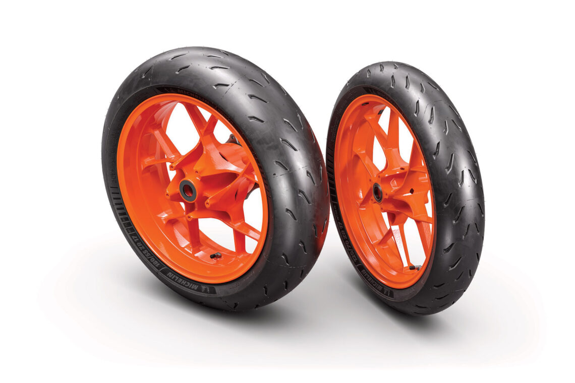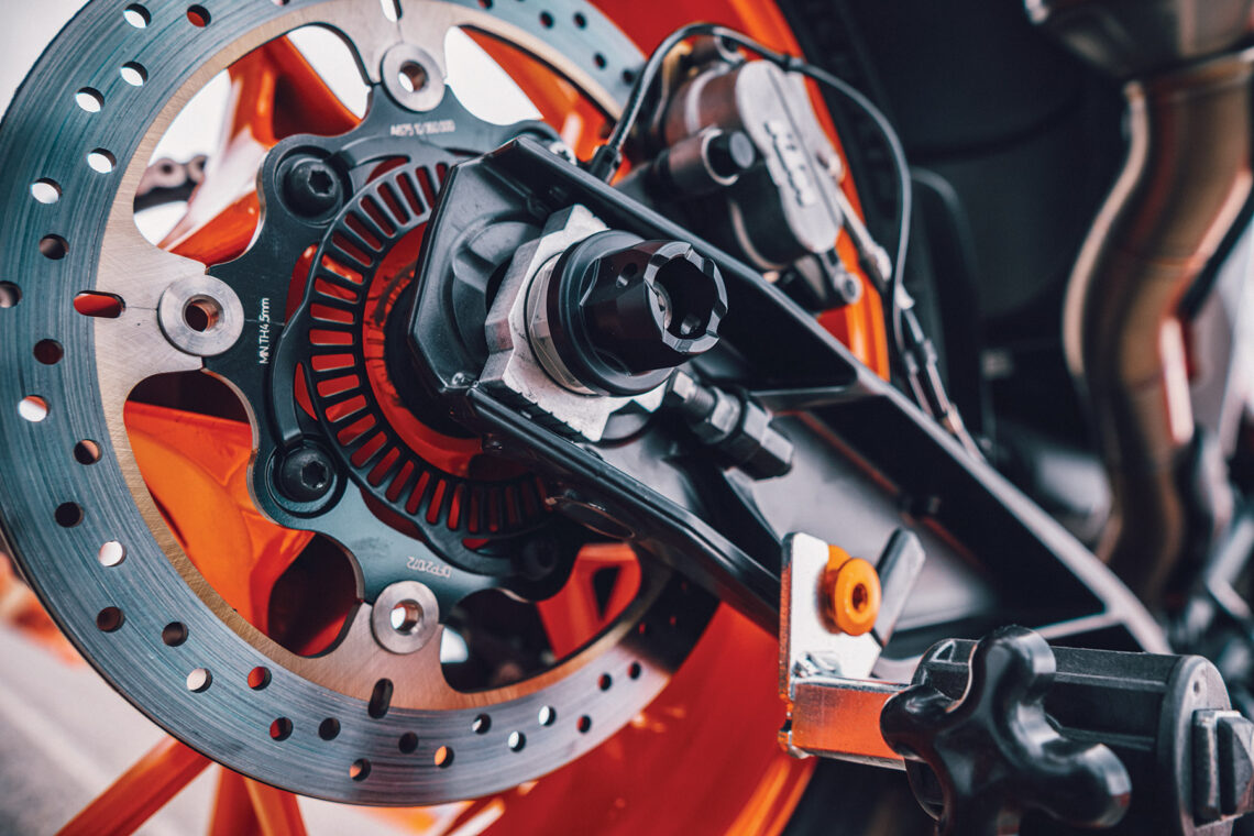 En los frenos encontramos un equipo KTM con pinzas radiales de 4 pistones, discos delanteros de 320 mm, latiguillos metálicos y bomba de freno axial.