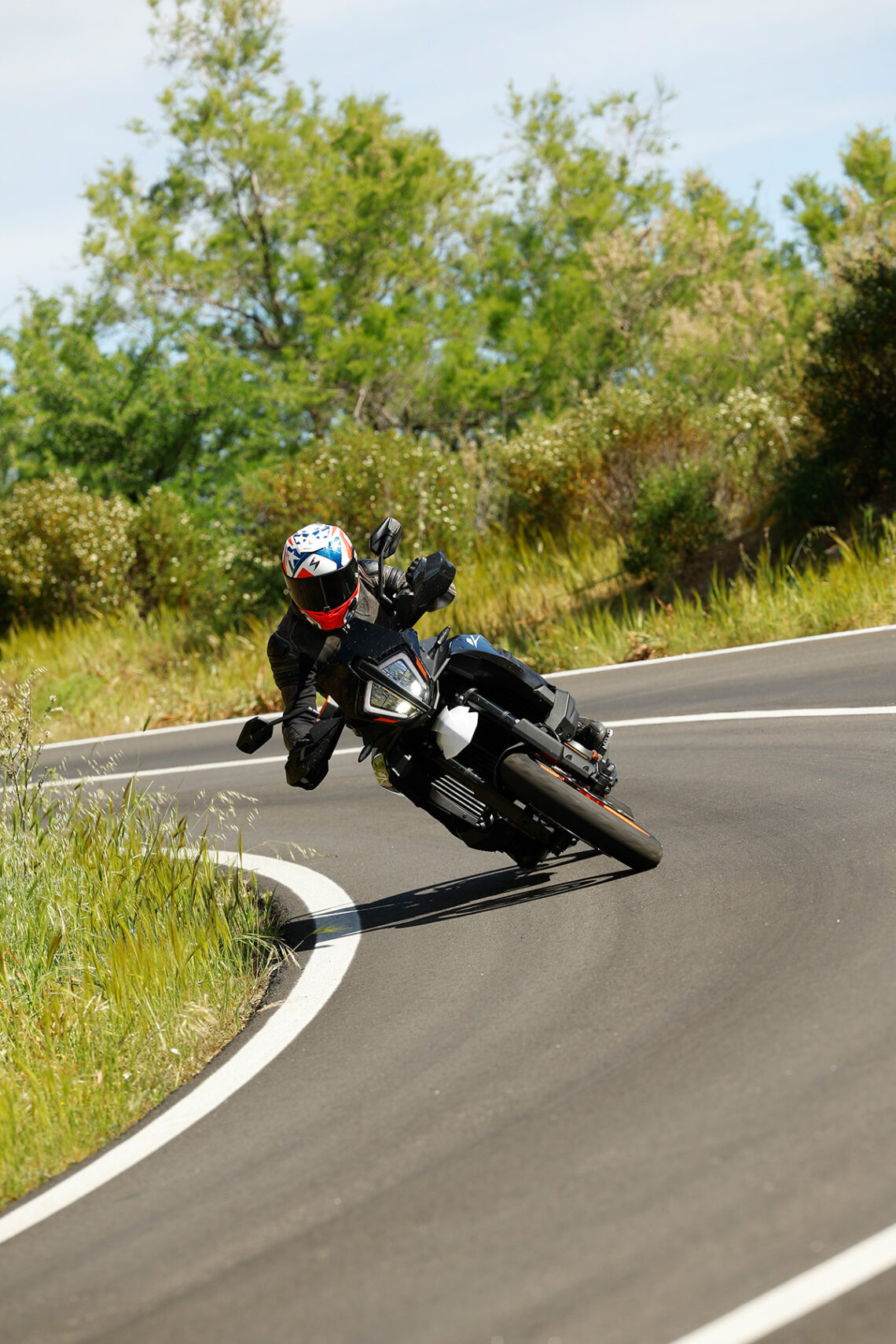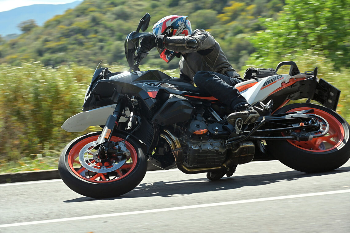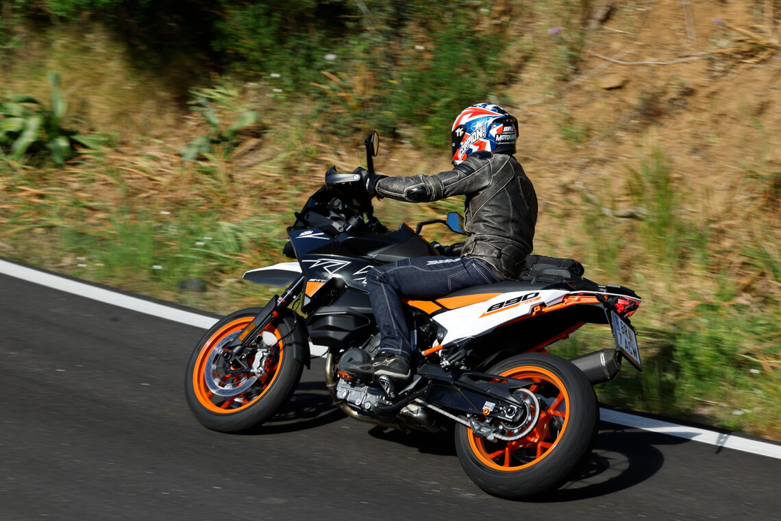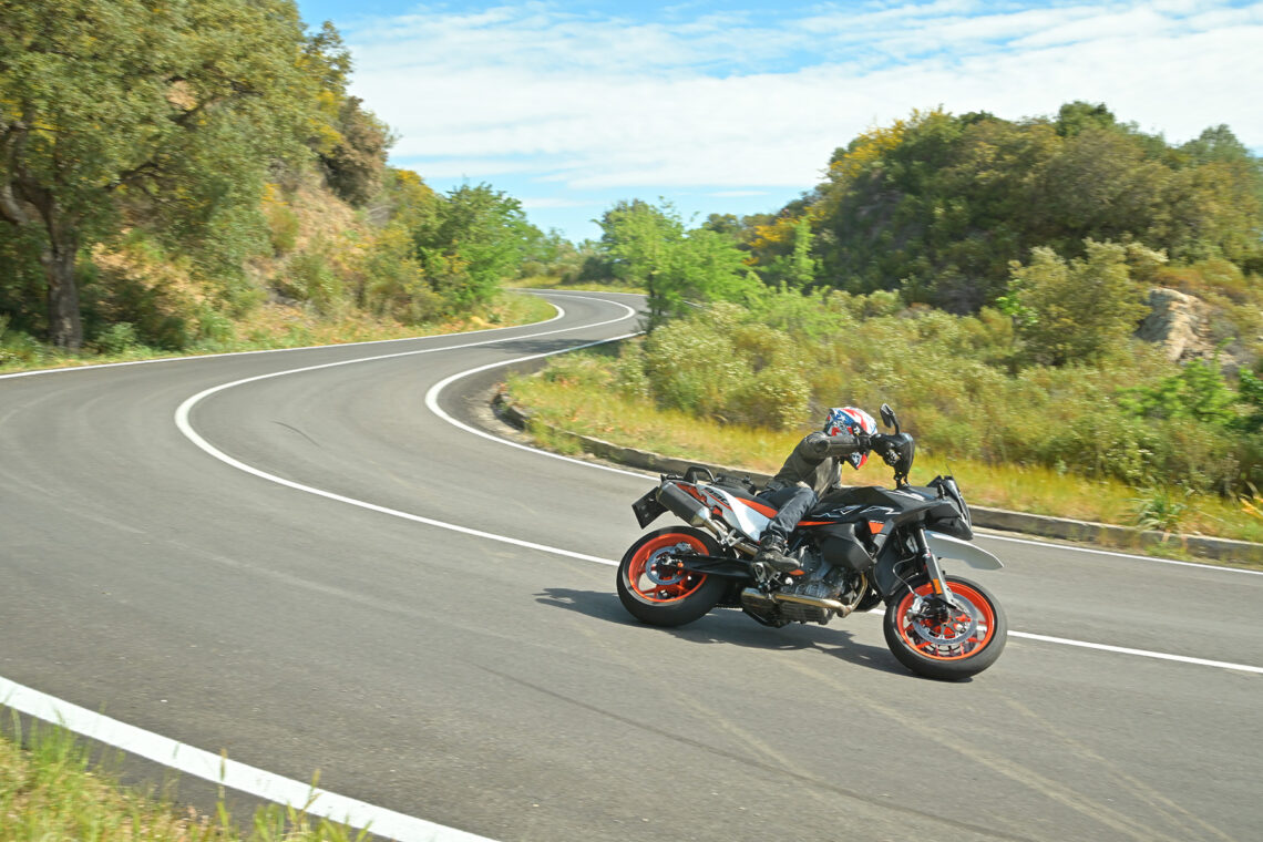 Ahora llega casi lo mejor, el ciclo de la KTM 890 SMT. Las suspensiones son una obra maestra, tienen un tacto de inicio blando y rápido, pero con la sujeción suficiente para poder ir "ligerito". Lo mejor de todo es que copian todos los rizos, baches y agujeros que hay en el asfalto no solo sin ningún problema, sino con la efectividad necesaria para poder ir rápido como digo. Es cierto que sufre un poquito de cabeceo y excesivas transferencias de peso cuando frenamos fuerte, pero como tiene un (relativo) recorrido largo de suspensiones, siempre hay buen acopio de las ruedas sobre el asfalto.