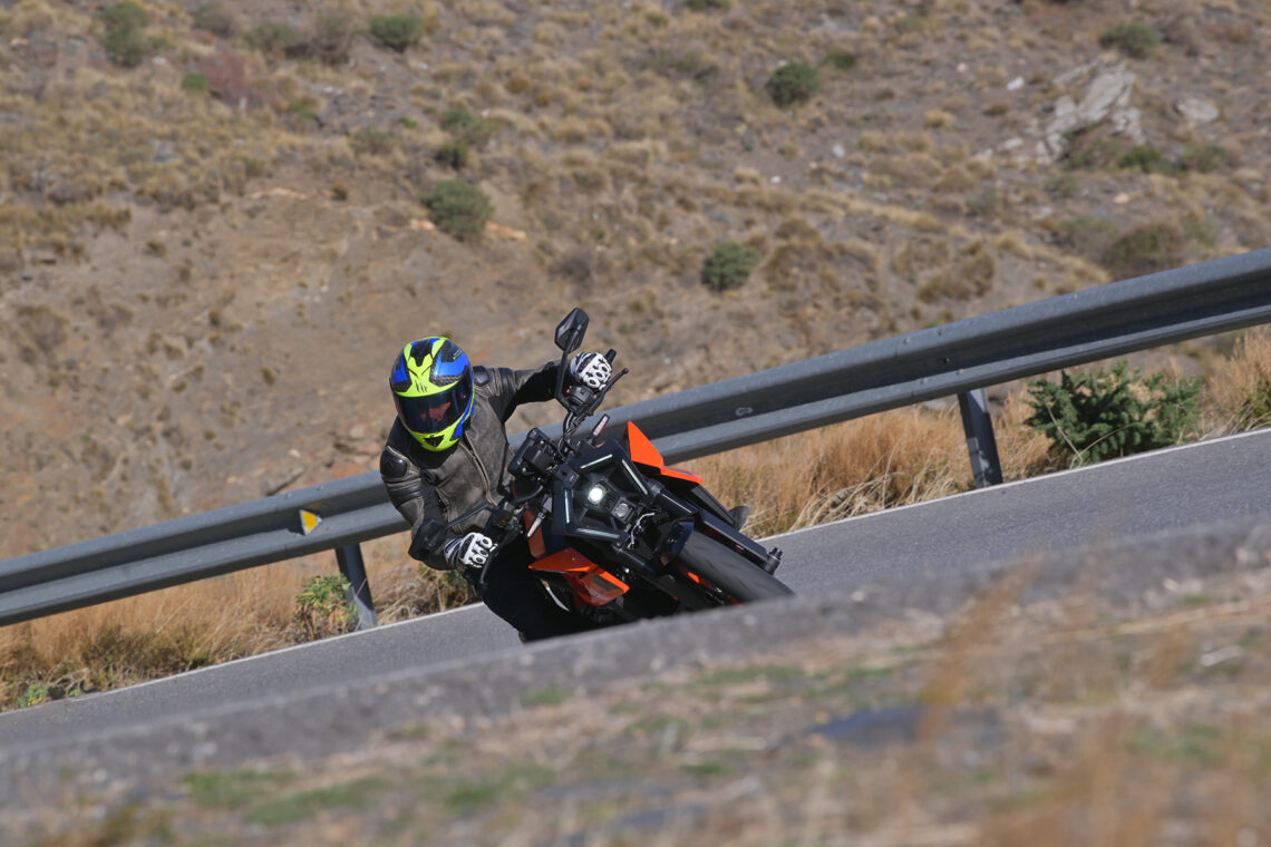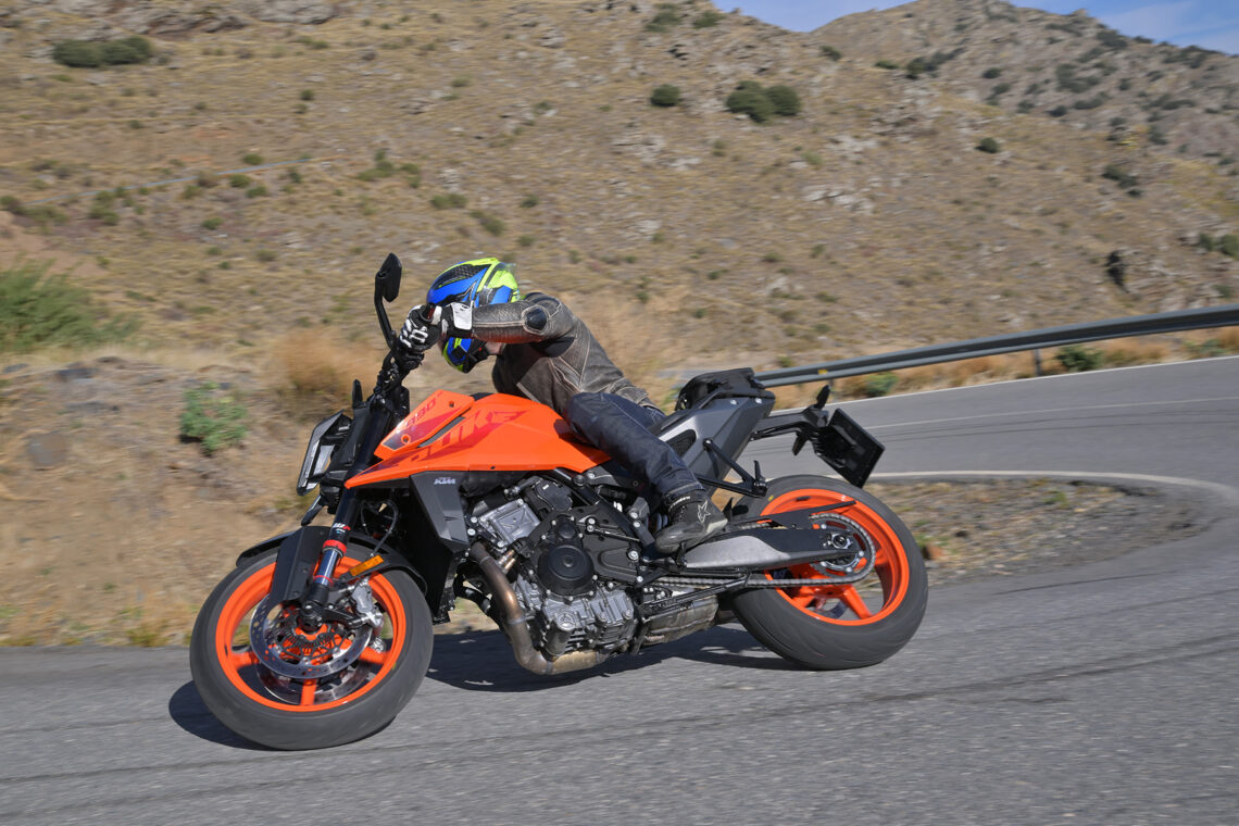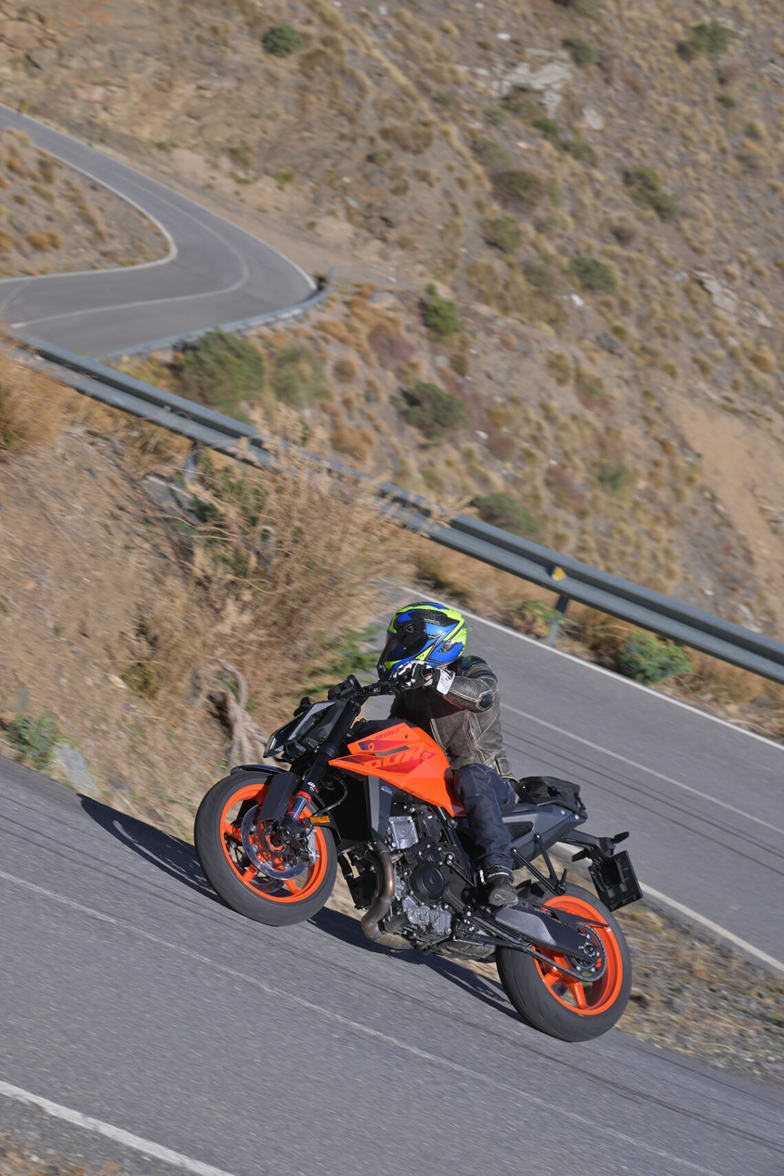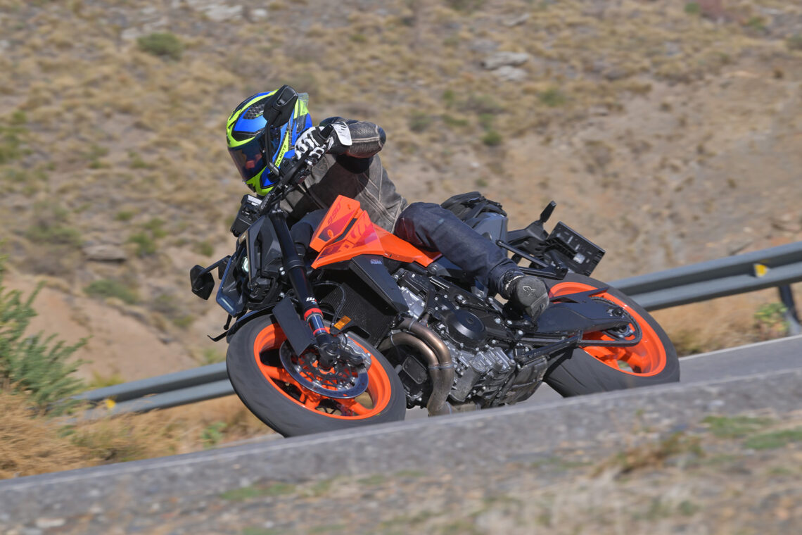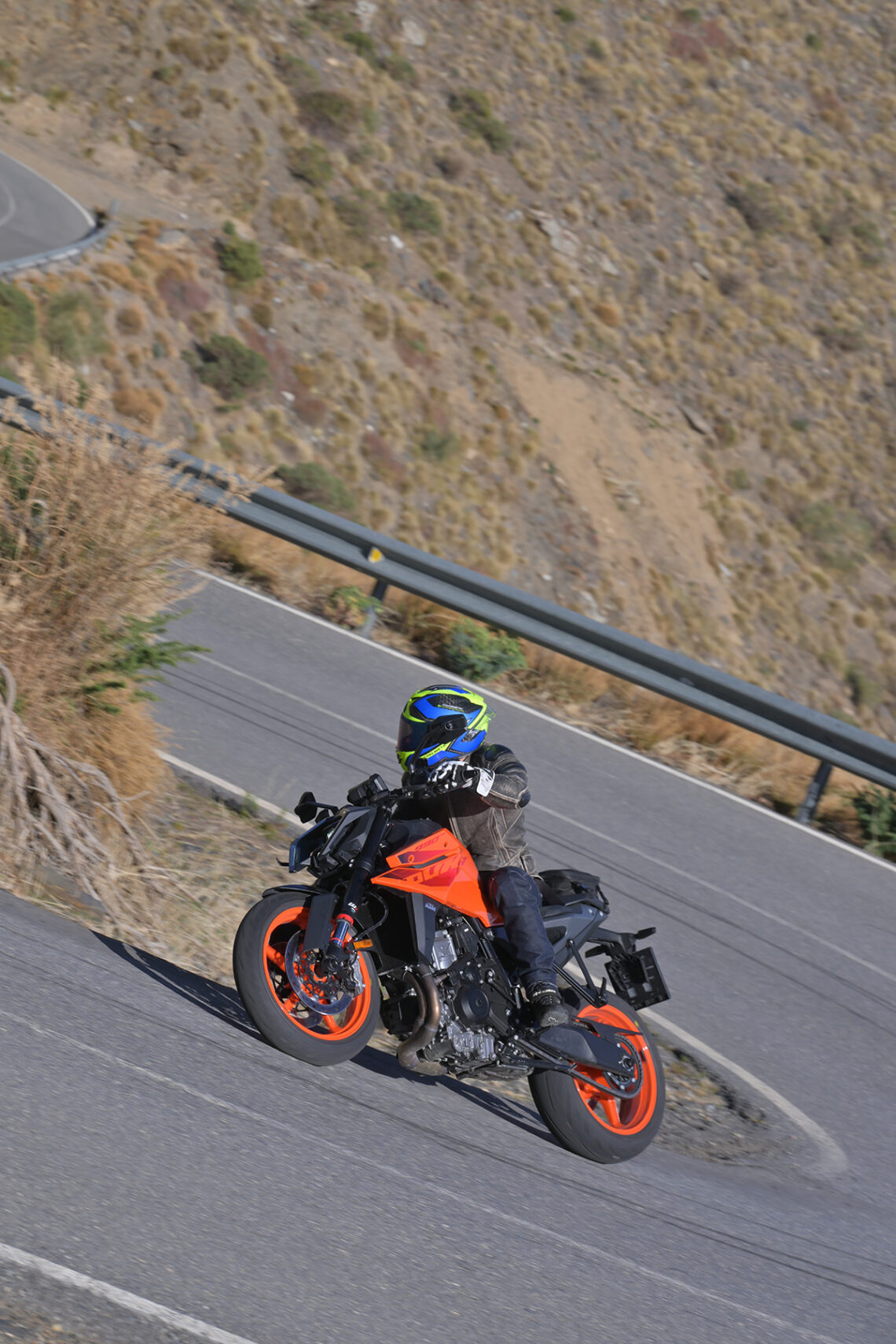 El pulso y la presencia de un "bi" de mil está ahí, y encima con el temperamento de KTM, aunque debo reconocer que ahora es bastante ajustable gracias a los modos de conducción, siendo el modo Sport el modo característico y genuino, y el modo Street una versión accesible, domada y agradecida de su entrega de potencia.