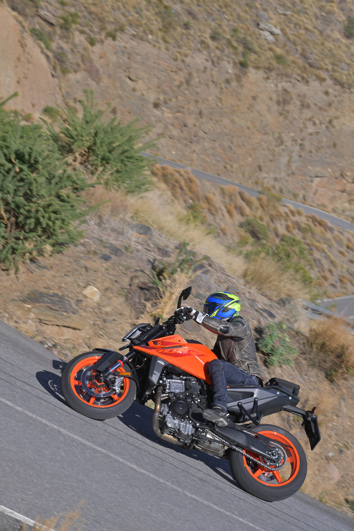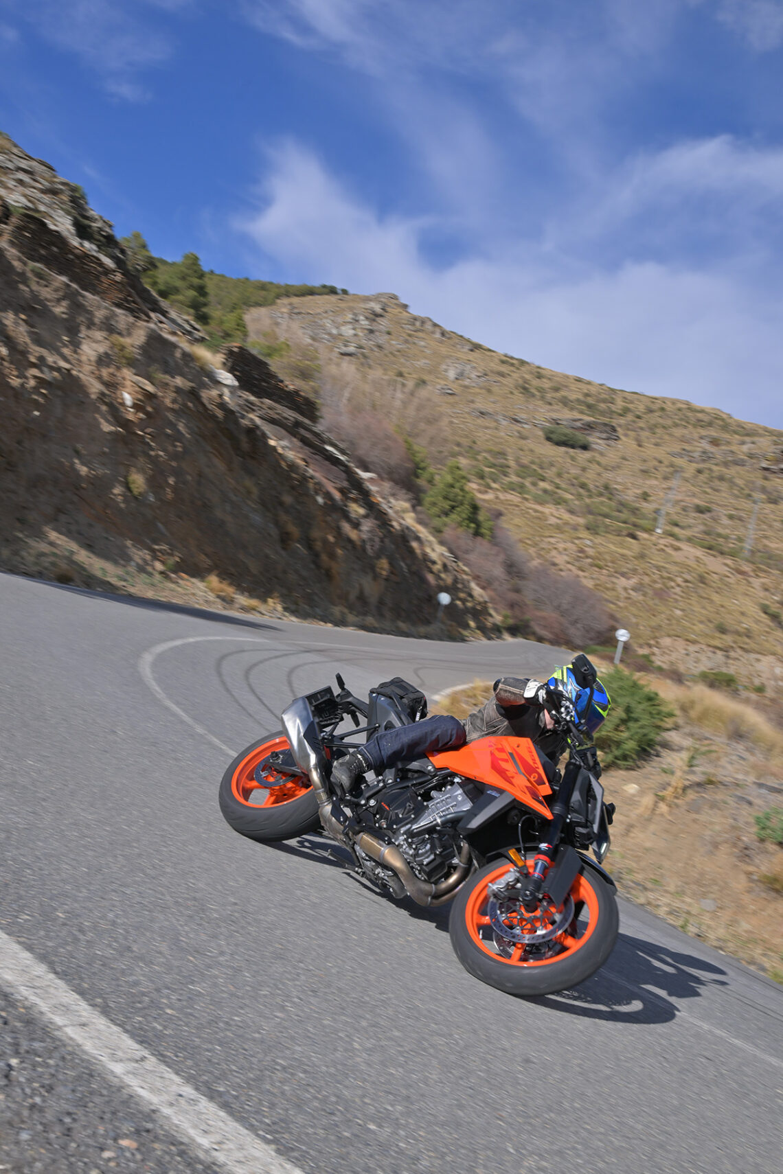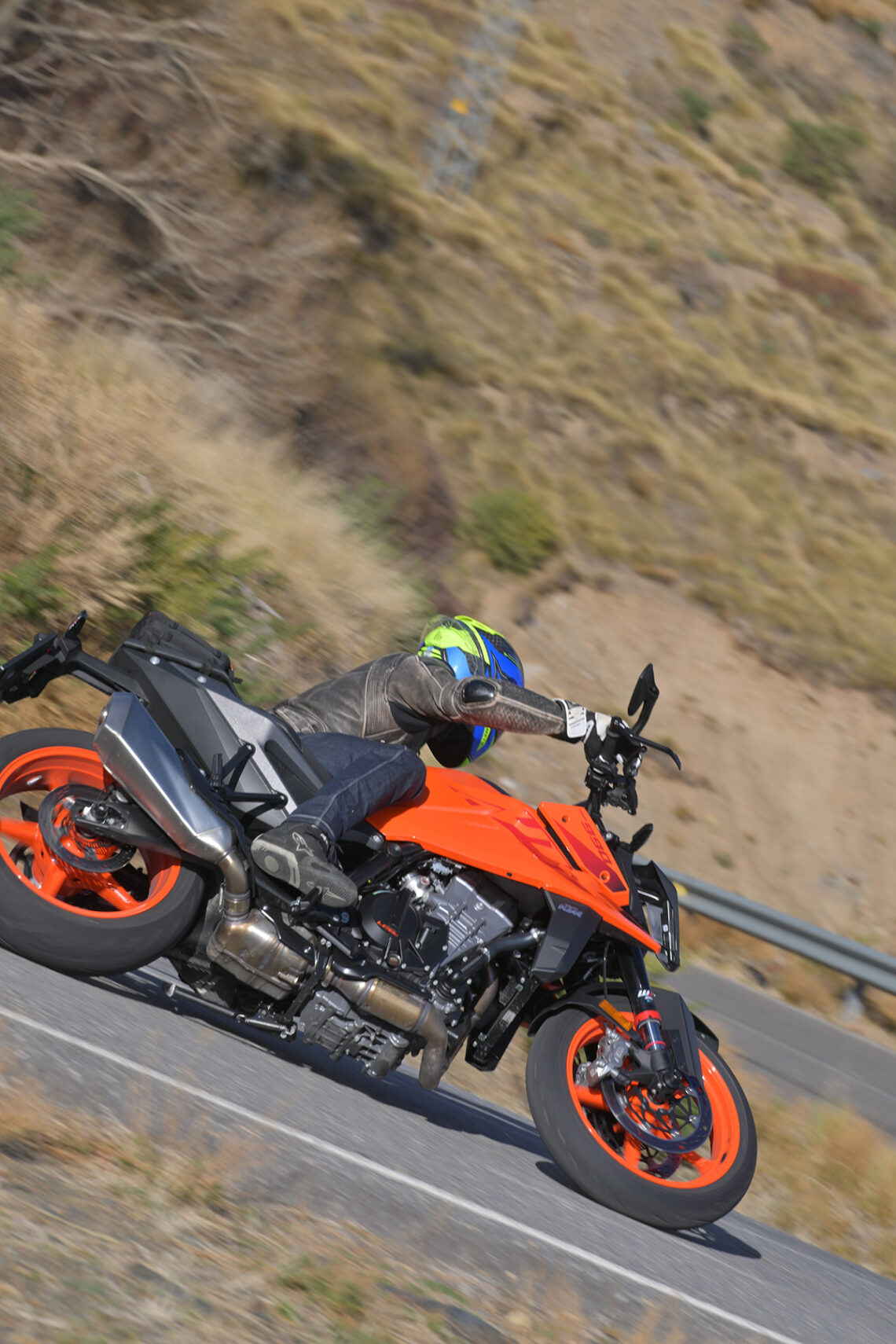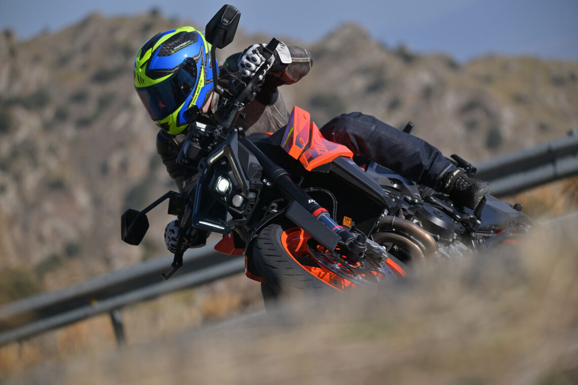 El pulso y la presencia de un "bi" de mil está ahí, y encima con el temperamento de KTM, aunque debo reconocer que ahora es bastante ajustable gracias a los modos de conducción, siendo el modo Sport el modo característico y genuino, y el modo Street una versión accesible, domada y agradecida de su entrega de potencia.