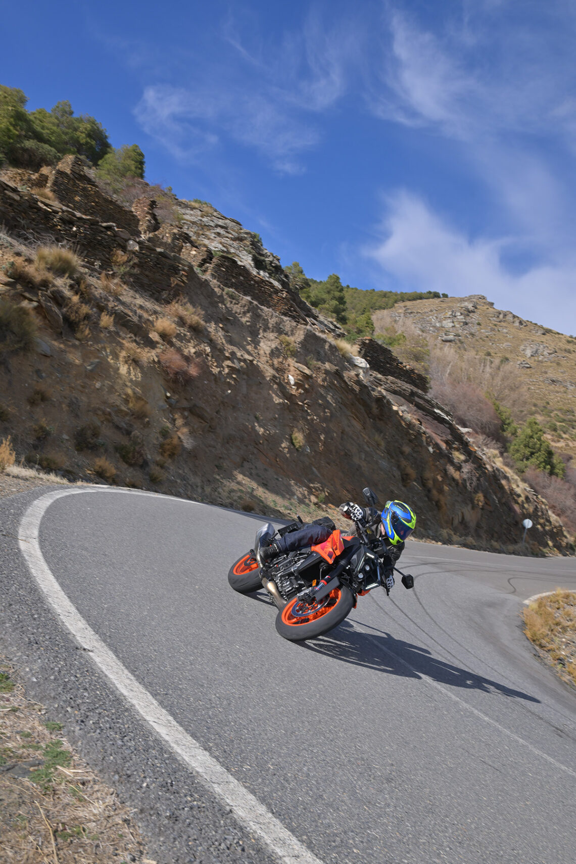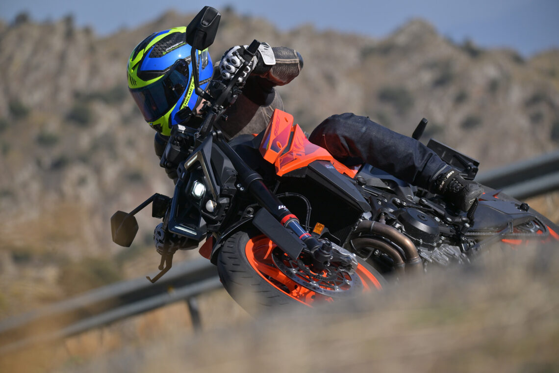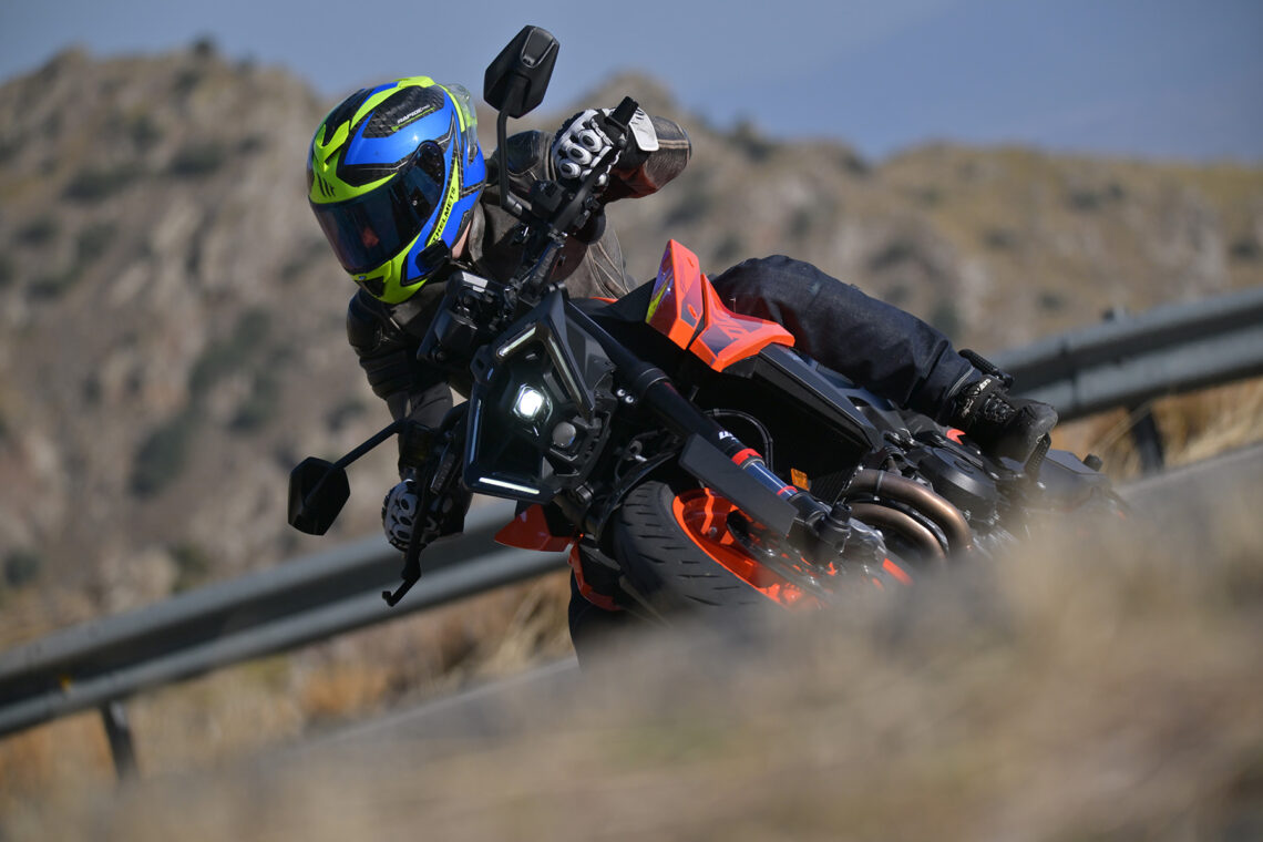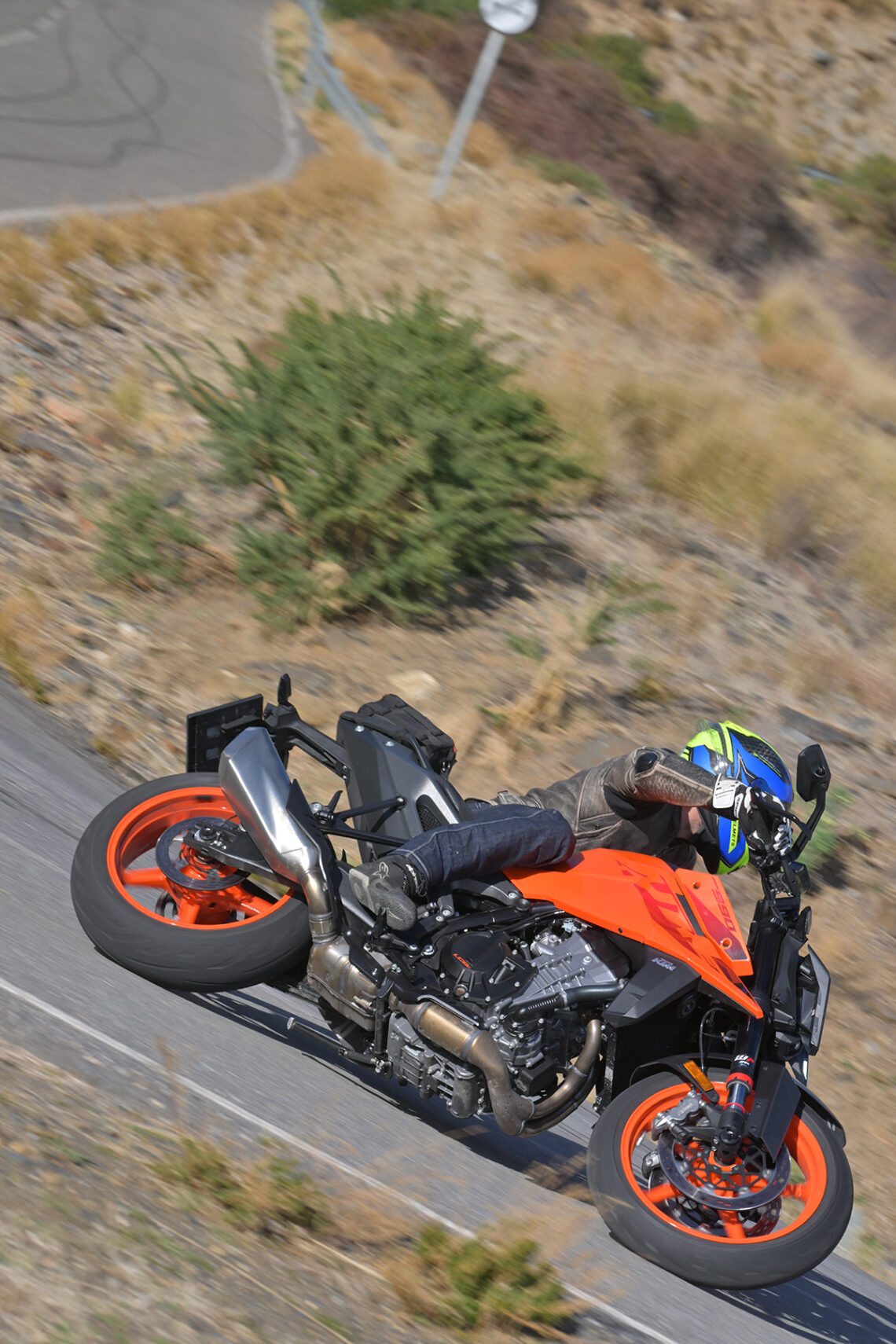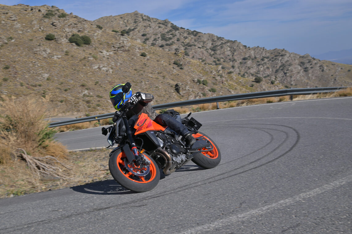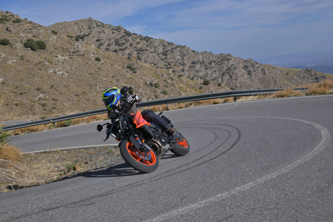 El pulso y la presencia de un "bi" de mil está ahí, y encima con el temperamento de KTM, aunque debo reconocer que ahora es bastante ajustable gracias a los modos de conducción, siendo el modo Sport el modo característico y genuino, y el modo Street una versión accesible, domada y agradecida de su entrega de potencia.
