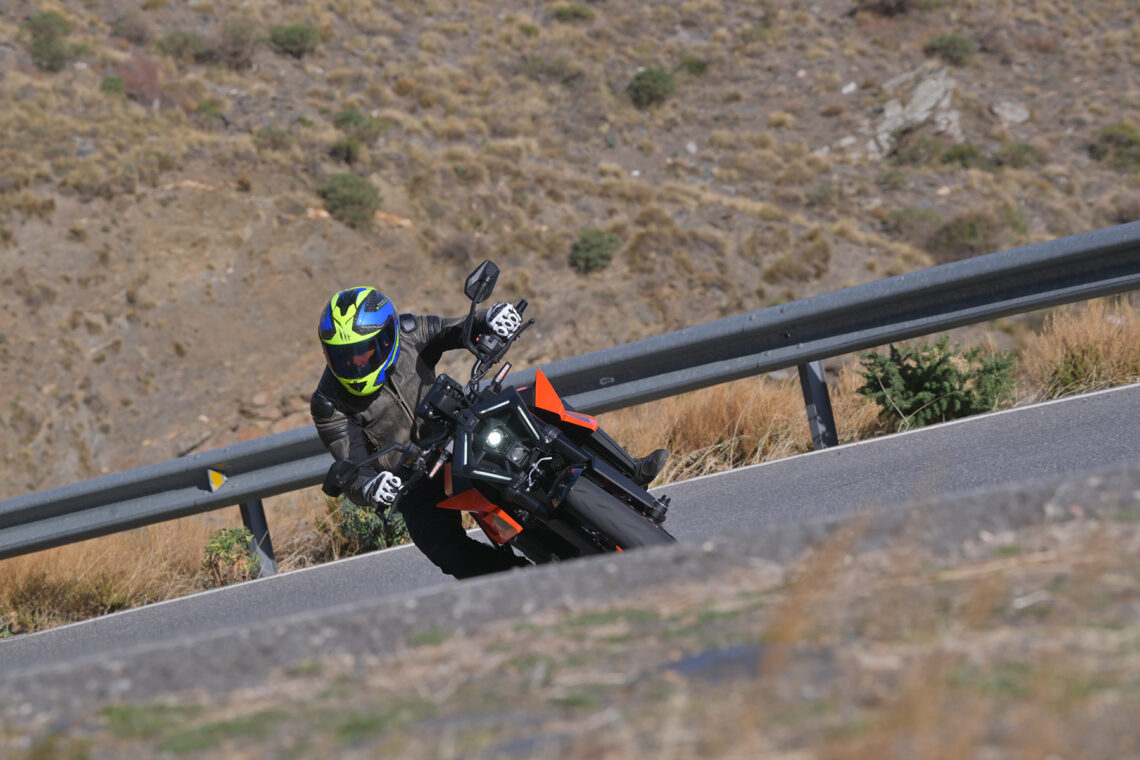 En mi caso, así fue, y como suele ser costumbre en mi, tras una leve bajada de presiones, elijo una entrega de potencia Street, un control de tracción bajo, el ABS en supermoto, y el anti-wheelie al mínimo. Con esto es como si en el Streets of Rage llevaras a Adam y sus ataques aéreos, guiño guiño. Sin duda, la mejor combinación, aunque como dato curioso debo mencionar que en lo alto del puerto de Velefique, a 1.800 m, tuve que cambiar el modo de conducción a Sport, ya que la altitud restó un poquitín de potencia y ya, el juego aéreo de Adam no era tan evidente. Dicho de otro modo, en 2ª marcha no levantaba tan fácil.