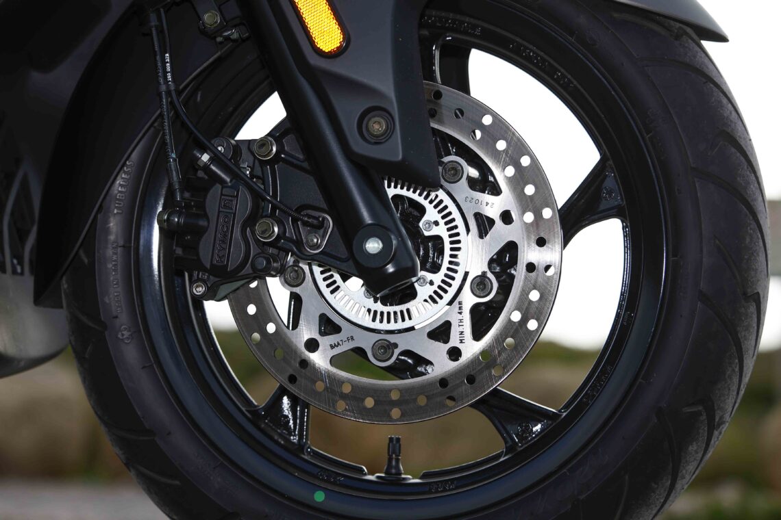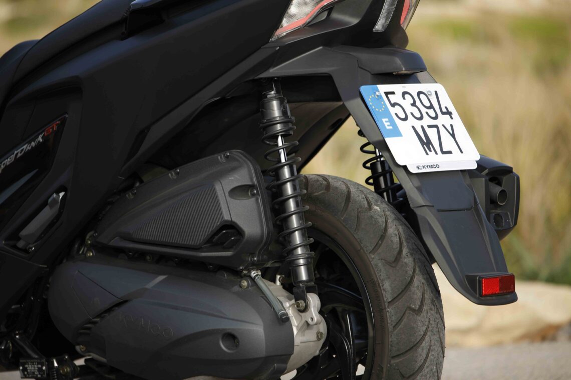 En todos los escenarios, el KYMCO Super Dink GT 350 se comporta con una gran estabilidad, con un buen trabajo en las suspensiones, pero también algo en lo que las ruedas agrandadas le ha venido 'de cine'. Esto junto a otros ajustes de chasis, peso (-7 kg) y de neumáticos (trasero más estrecho) le han hecho equilibrar muy bien sus características para alcanzar un magnífico compromiso. Incluso buscándole las cosquillas, puedes conseguir mantener la calma y confiar en su aplomo. Además, a diferencia de otros modelos de scooter, resulta difícil rozar con la pata lateral o el caballete central, algo que 'conseguí' sólo al atacar y enlazar algunas curvas con un poco de más agresividad a la hora de afrontar la subida al Monte Toro. Su batalla larga típica de scooter GT no le permite ser tan ratonero en tramos de curvas cerradas, pero se defiende bien al asumir una conducción dinámica y divertida. En cuanto a los neumáticos Maxxis, poco que decir: correctos y suficientes para lo que se les exige.