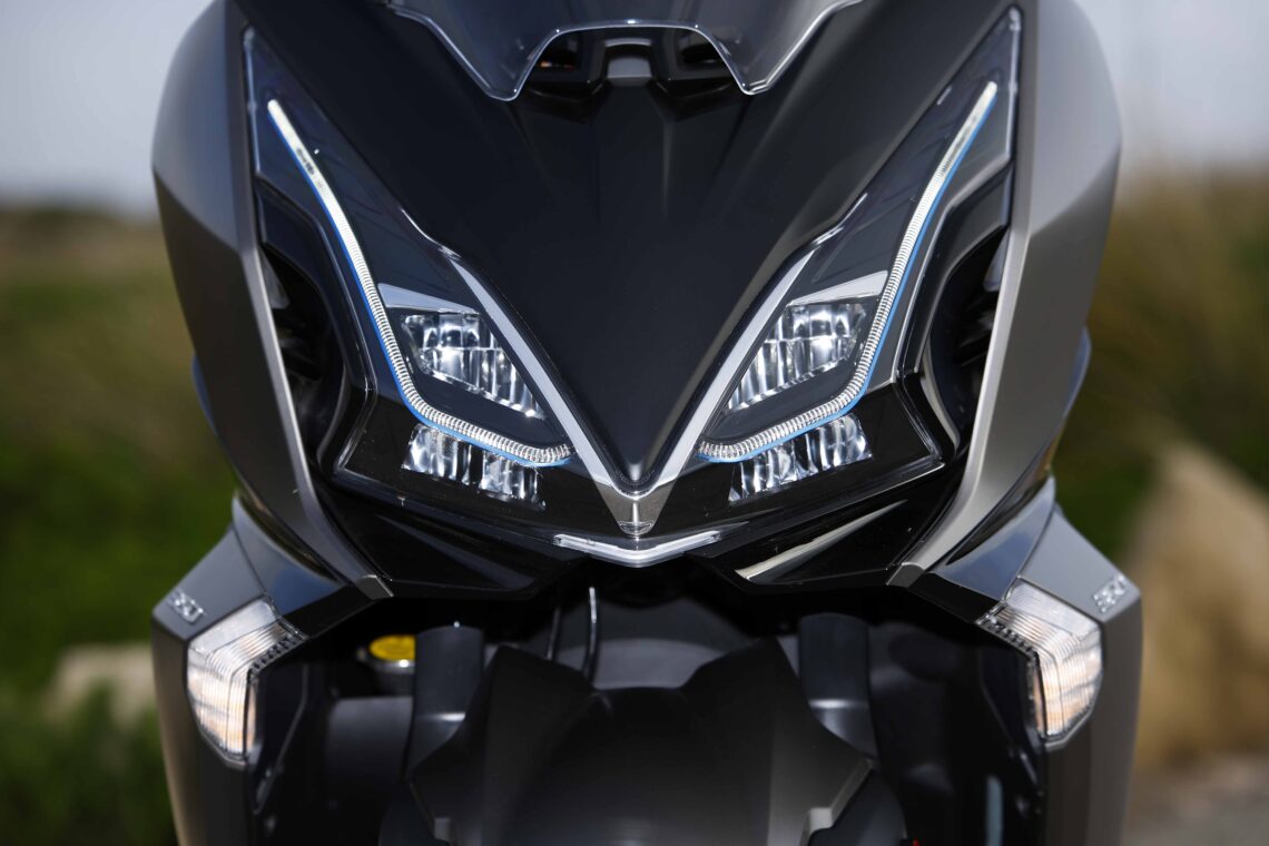 Antes de empezar, la estética del scooter siempre llama la atención por su elegancia, más si cabe por los colores elegidos, sobre todo el marrón, que parece muy oscuro en cierta perspectiva para convertirse en un tono muy discreto y bien parecido a cierta distancia. Siguiendo con su look, nos sorprendió su orientación más deportiva en la zona delantera, incluso con detalles como el mencionado hueco que deja entre la carrocería y cada faro. Sin más, un apunte que le queda bastante bien y nada pretencioso.