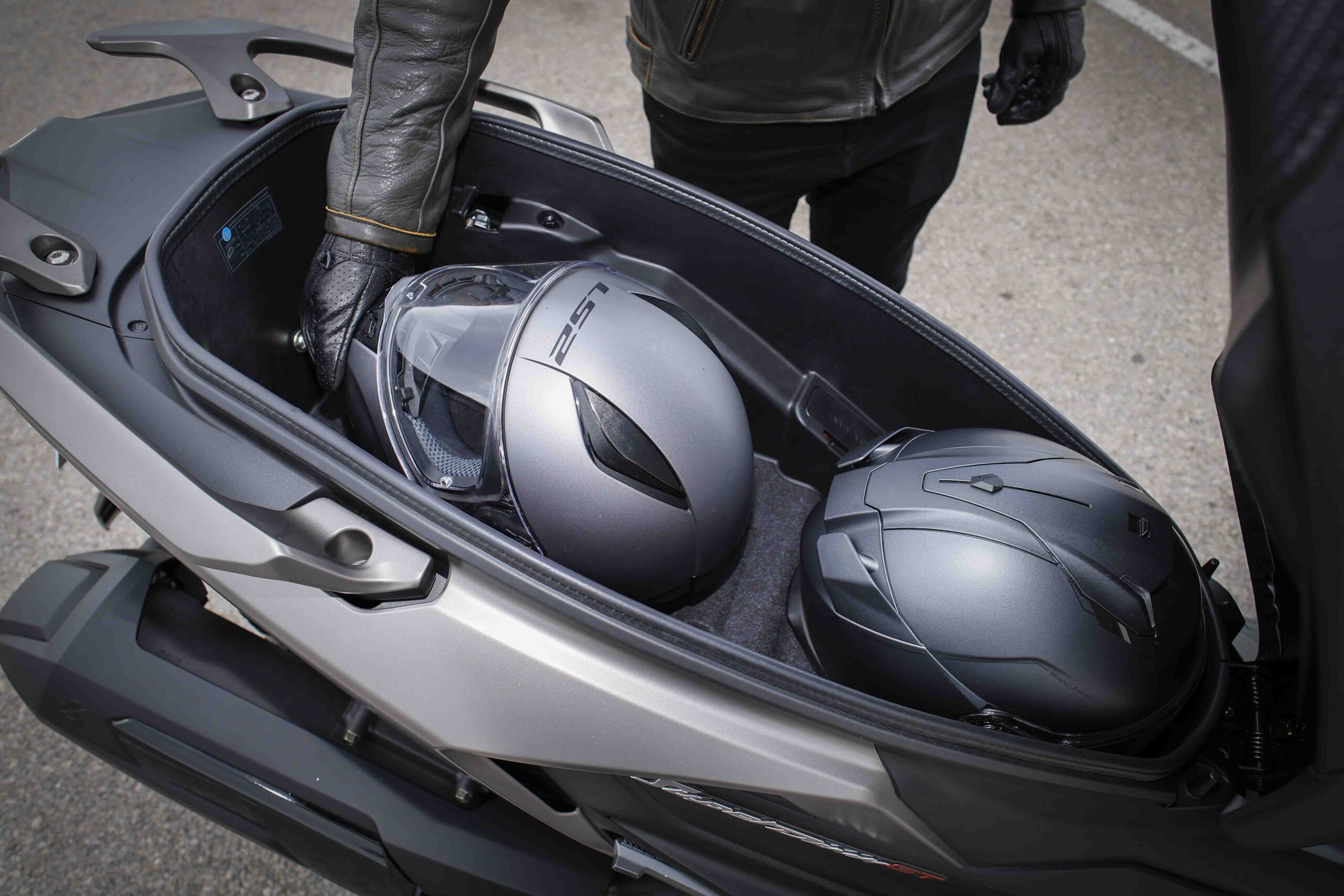 El espacio del asiento es muy generoso, ideal para la comodidad del día a día o travesías más largas, pero reconozco que me encanta ver el espacio interior en el que caben nada menos que dos cascos integrales ¡y alguna cosa más!