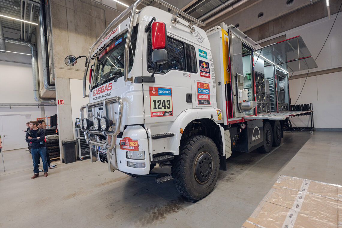 En el hall de entrada ya teníamos una muestra del poderío, con una GasGas y una KTM de MotoGP, unas campeonas del mundo de enduro y motocross y unas unidades históricas, como una 125 de Marc Márquez y una 'tres y medio' de Toni Cairoli. Empezamos fuerte. Y tanto, ya que la primera parada la hacíamos en la zona de los técnicos de MotoGP, con algunas unidades puestas en los elevadores mientras nos explicaban algunas rutinas del equipo o las alucinantes prestaciones de estas máquinas. Una vez más, sorprende la limpieza y el orden. No ves suciedad o unas herramientas amontonadas en cualquier sitio. Parece mentira que sea un taller... Más actividad había en la zona del equipo de motocross, pocos metros más allá, donde las motos estaban siendo revisadas y mantenidas recién llegadas desde el último gran premio celebrado en Madrid y ponerlas a punto para la siguiente cita. No lo podíamos creer: ¡estábamos en uno de los centros de desarrollo de la moto más tecnológicos del mundo! Fue muy interesante ver de cerca un camión de asistencia del Dakar (y del resto de citas del Mundial de rallies). El colosal vehículo, en este caso del equipo GasGas, sirve de taller itinerante al que pueden acudir tanto los mecánicos oficiales como también los pilotos privados para arreglar sus motos. No podemos hacernos a la idea de la cantidad de neumáticos (cientos) y un gran catálogo de repuestos que deben transportar estos colosos del desierto y el papel que desempeñan tan fundamental para sus equipos.