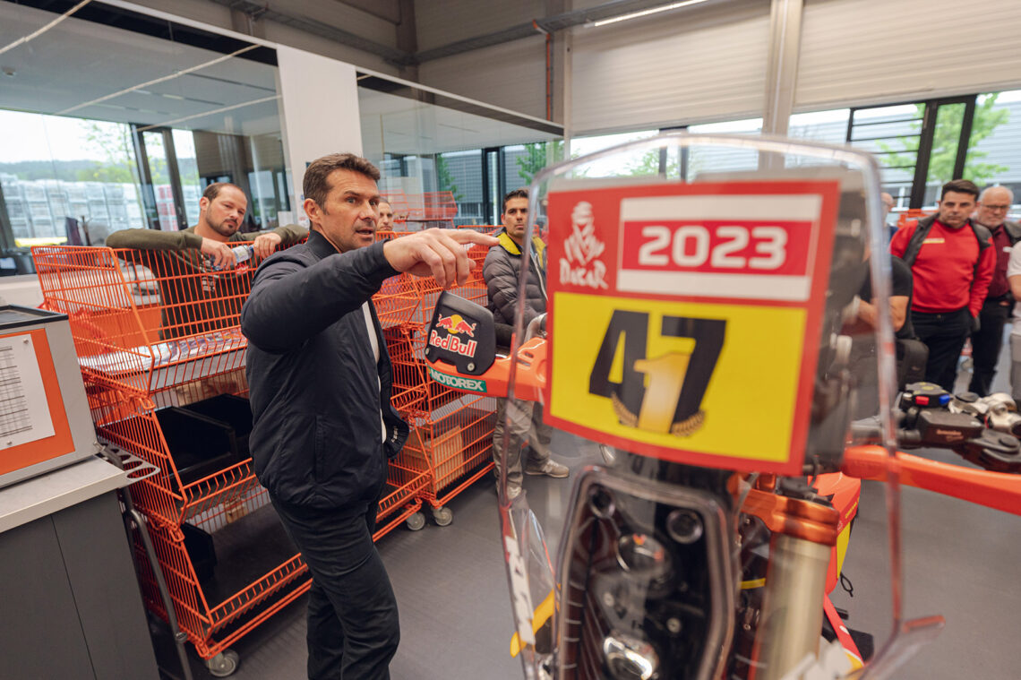 Con la llegada de Pierer a los mandos de la marca, se decide embarcar en diferentes competiciones con todo el apoyo oficial. En concreto, en 1994 la fábrica lleva una moto pilotada por el también austriaco Heinz Kinigadner, un piloto que ya tenía en su palmarés nada menos que dos campeonatos del mundo de motocross de 250 cc. Completó una interesante carrera como piloto de raids, con varias victorias reseñables, pero no consiguió completar ninguno los siete 'dakares' en los que formó parte, algo con lo que bromeó varias veces durante la presentación. Sí, 'Kini' estuvo en esta inauguración, y es que, después de bajarse de la moto, se convirtió en responsable deportivo de KTM en los raids, cargo en el que le ha ido incluso mejor.