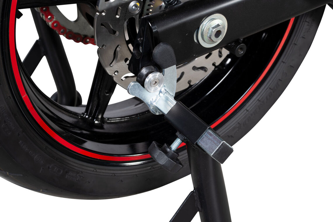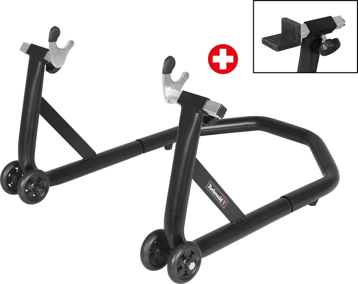 El diseño del caballete Rothewald permite su operatividad de manera práctica, pudiendo ajustarse a cualquier moto gracias a sus adaptadores laterales regulables, tanto en forma de V como en forma de ángulo recto, ambos con goma protectora para evitar rayar el basculante.
