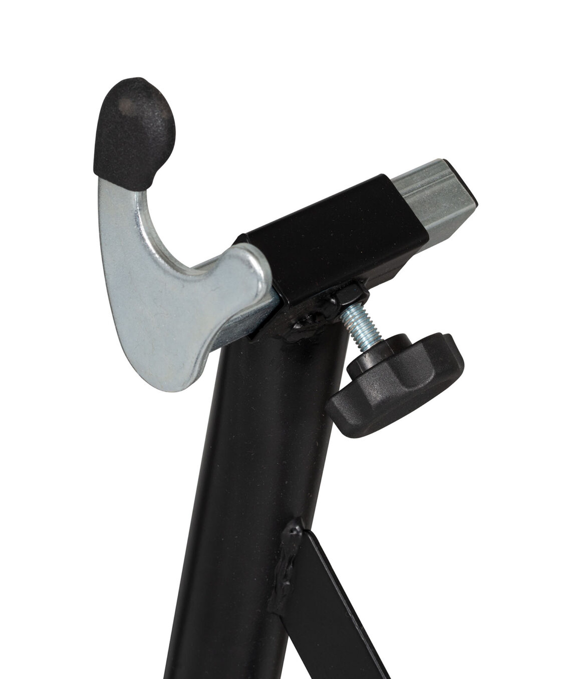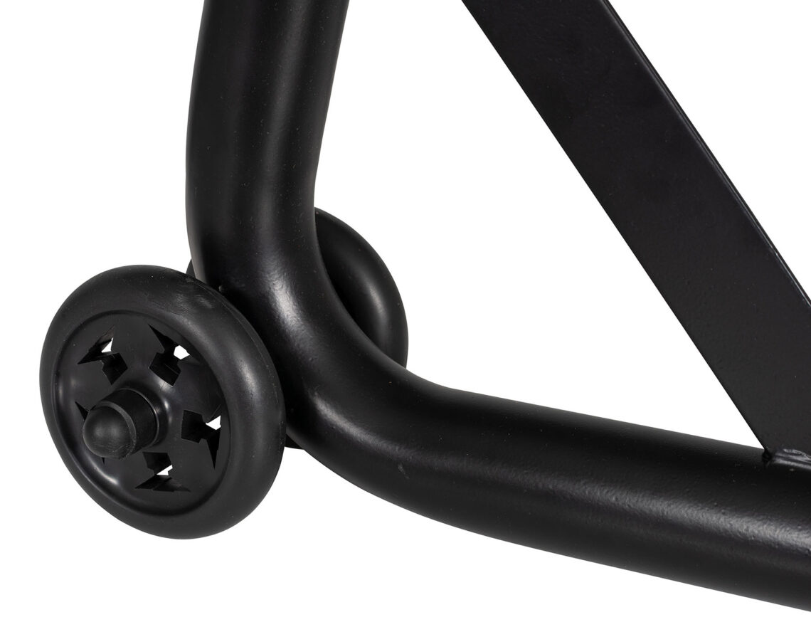 Su diseño con refuerzos en forma triangular le permite ofrecer una elevada capacidad de carga sin resultar pesado. A ello se añade su capacidad de moverlo gracias a las ruedas incorporadas, pudiendo transportar la moto en el caballete en espacios pequeños o cerrados.
