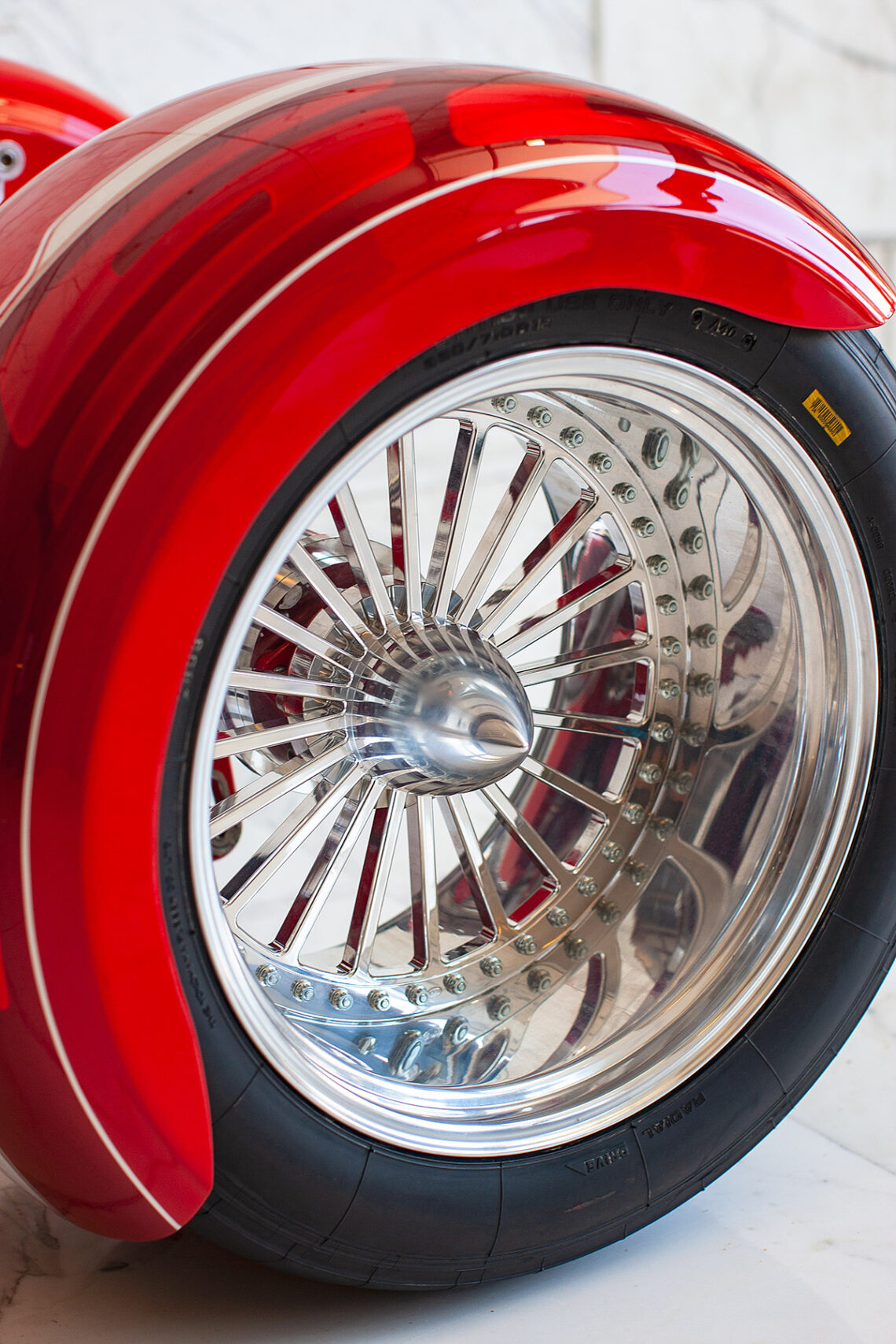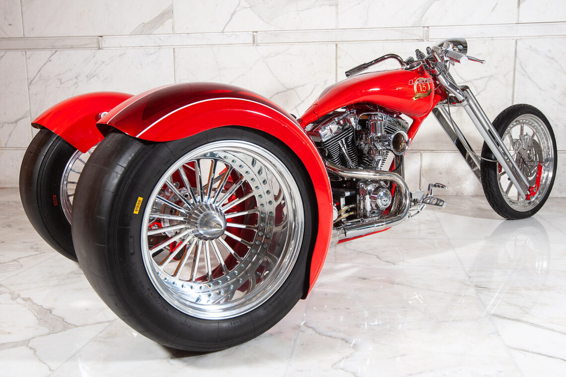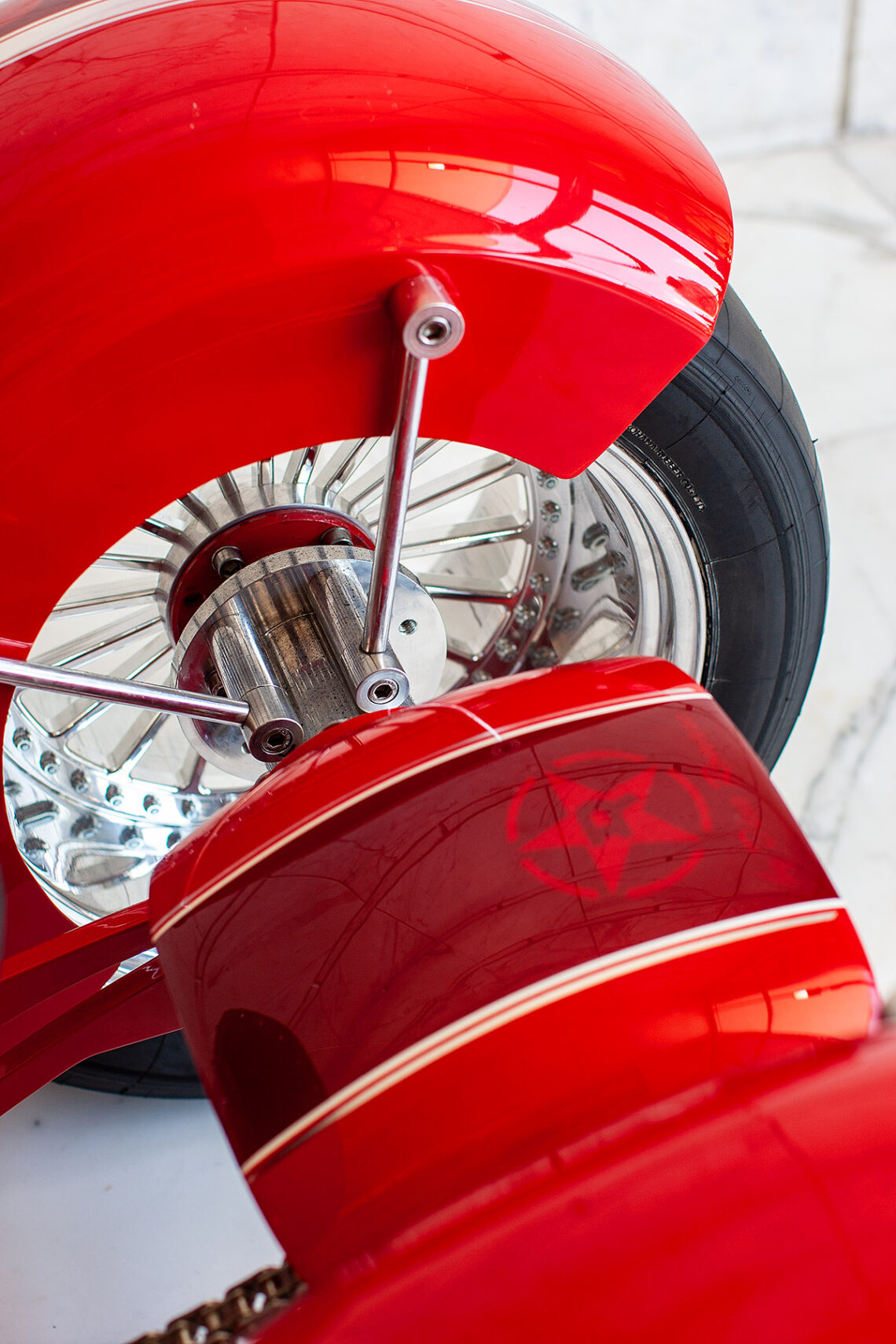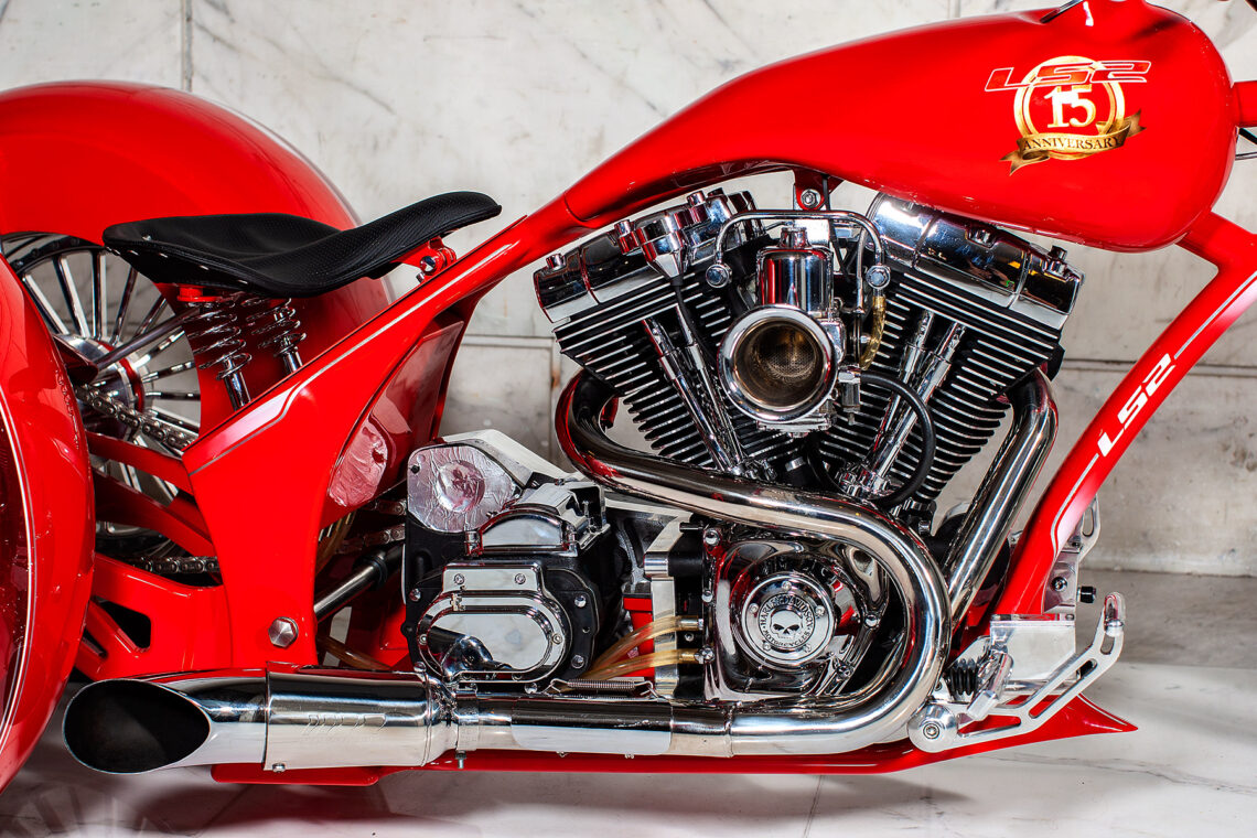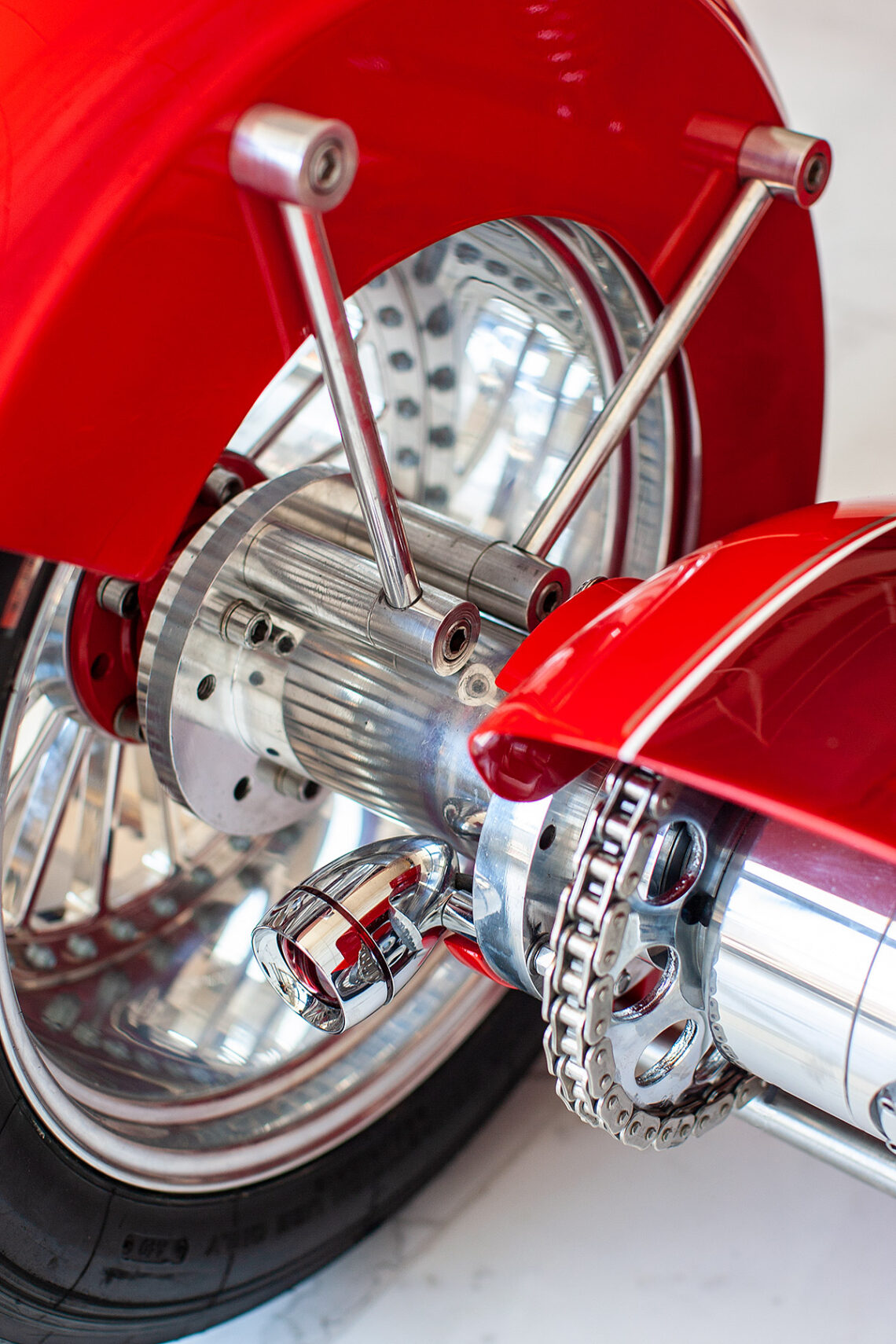 Como puedes ver el Trike LS2 jamás podría pasar desapercibido, con ese acabado en color rojo fuego y el logo de la marca en oro, todo pulido para dar un aspecto estético excepcional. Cómo no, detrás monta grandes neumáticos de coche.