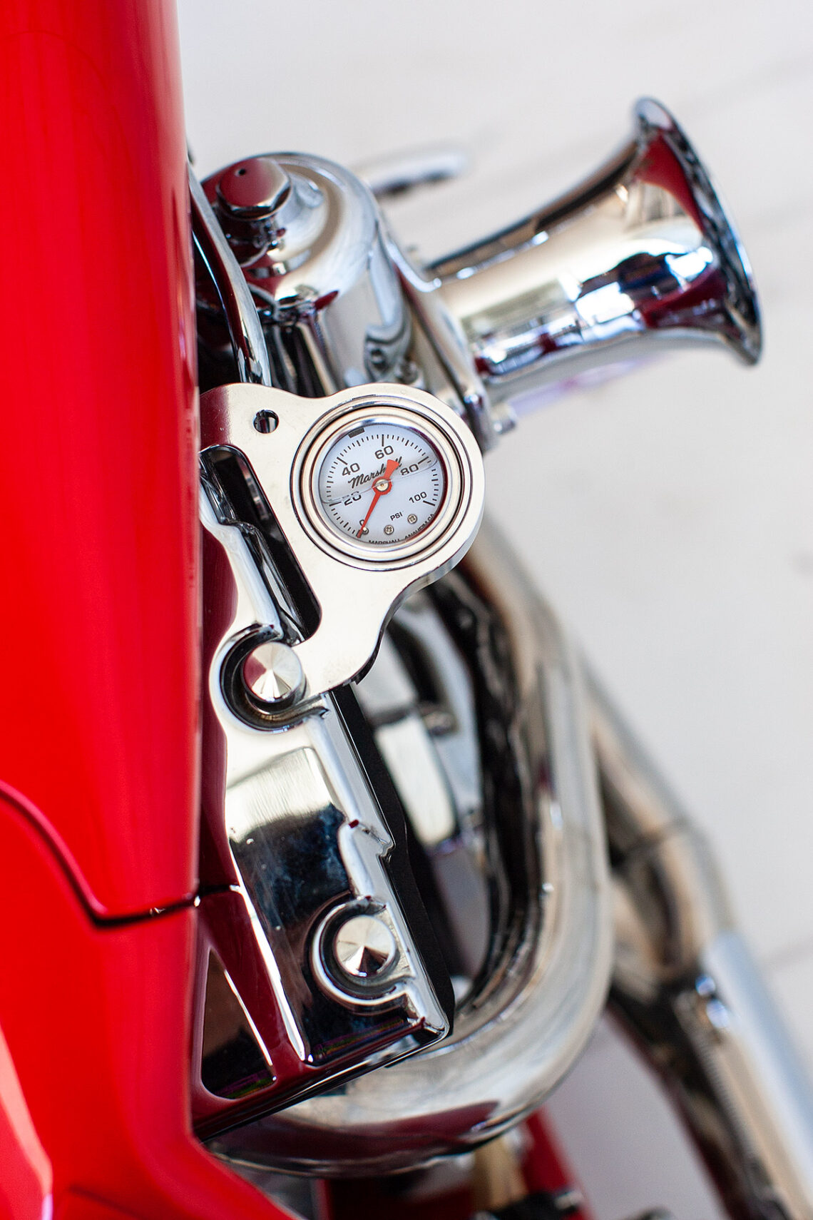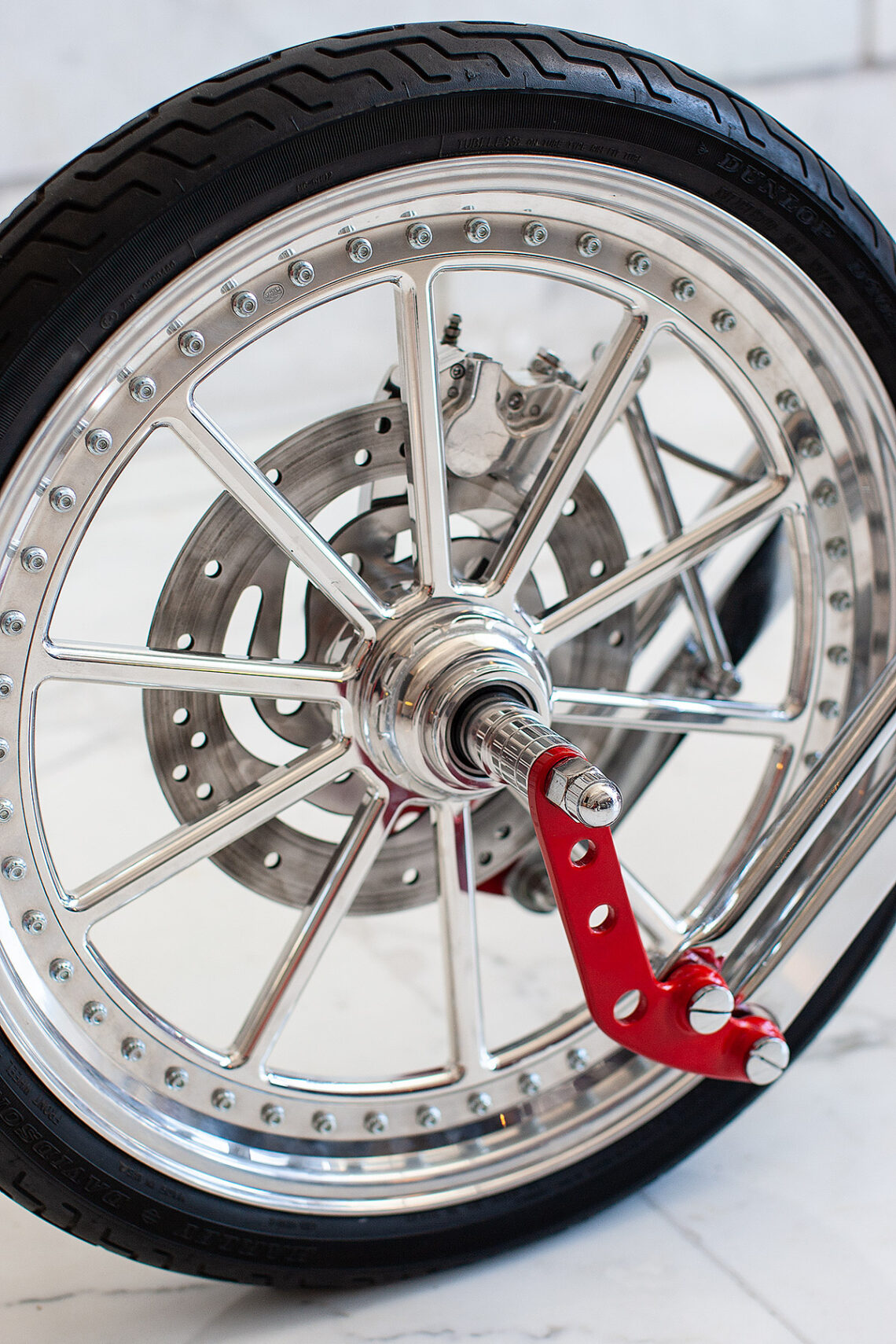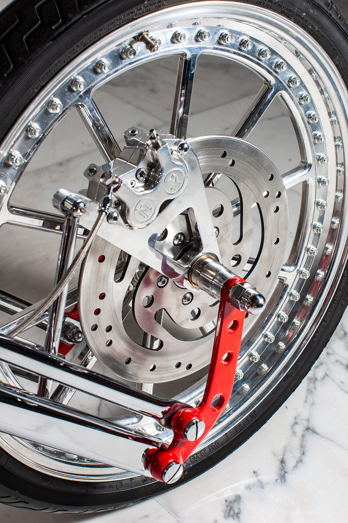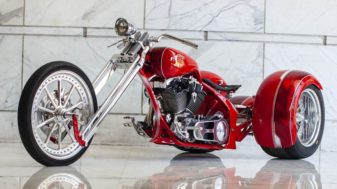 Como puedes ver el Trike LS2 jamás podría pasar desapercibido, con ese acabado en color rojo fuego y el logo de la marca en oro, todo pulido para dar un aspecto estético excepcional. Cómo no, detrás monta grandes neumáticos de coche.