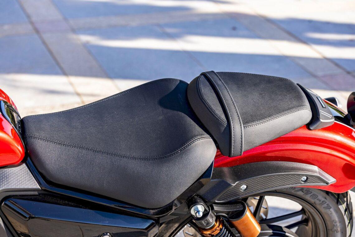 Sentados en ella, llegamos de sobra con los dos pies al suelo, el manillar es ancho y el asiento no dibuja esa 'U' tan pronunciada y típica de otras motos. Sus guardabarros recortados, los neumáticos de perfil alto y el minimalismo típico de las motos bobber se hacen muy patentes aquí.