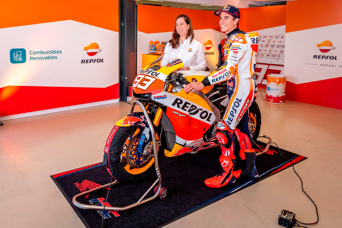 Márquez ha estado acompañado en todo momento en la rueda de prensa por Dolores Cárdenas, máxima responsable en Diseño de Producto en el Repsol Technology Lab, el que ha sido el centro de operaciones para el desarrollo de este biocombustible: «La clave de este tipo de combustible es que no se nota la diferencia en cuanto a sensaciones. La diferencia es cómo lo producimos estos combustibles renovables y tenemos dos tipos importantes: biocombustibles avanzados que proceden de residuos de la biomasa y los sintéticos, que se producen capturando C02, hidrógeno renovable. La organización de MotoGP ha comunicado su hoja de ruta hacia la sostenibilidad y el primer hito es en 2024, cuando tenemos que incorporar al menos un 40% de contenido renovable. En Repsol ya estamos trabajando en ello, de hecho ya hemos producido una gasolina 100% renovable en la Fórmula 4 francesa. Además, el equipo Repsol Rally Team, en el pasado Dakar ya utilizó una gasolina con el 50% de biocombustible. Ahora es el turno de MotoGP».