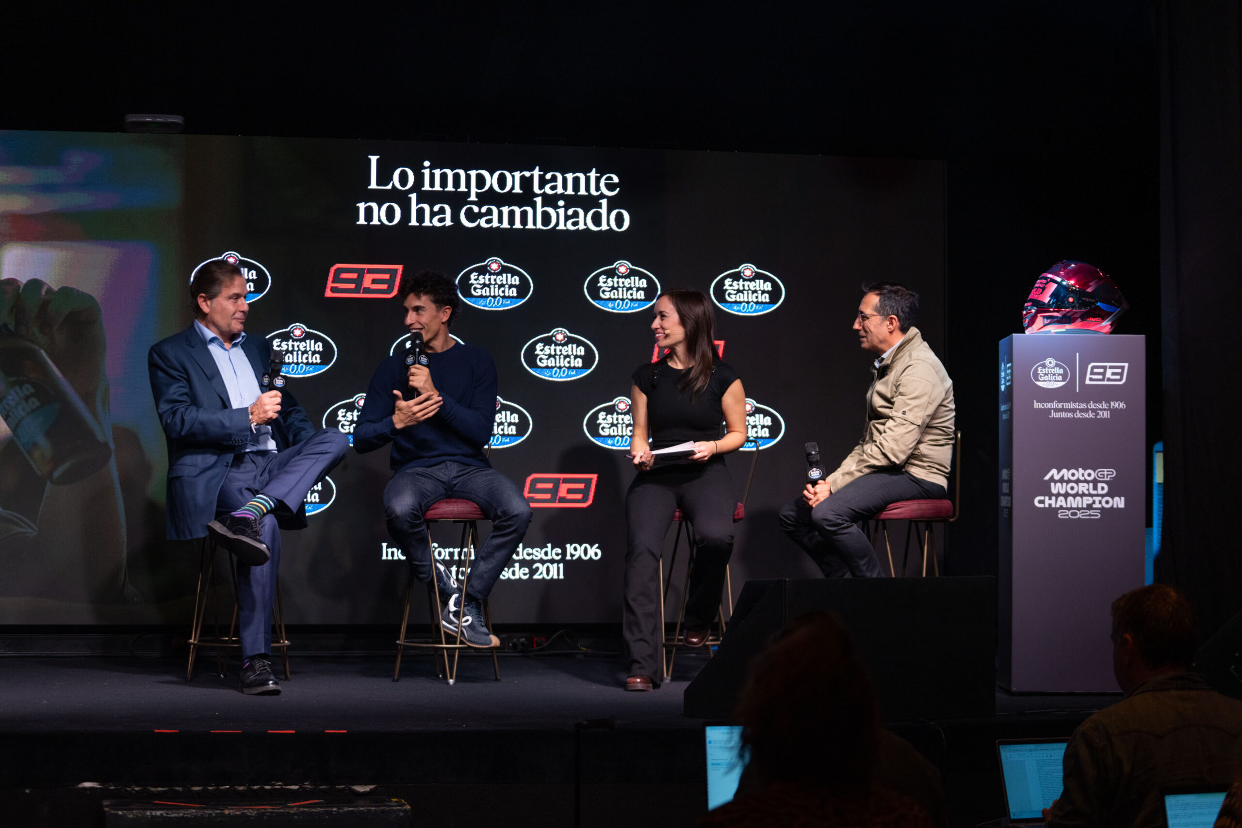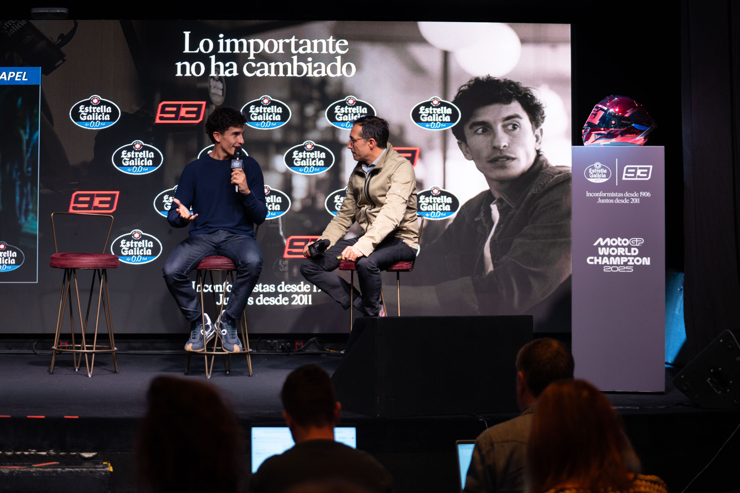 Primera comparecencia oficial de Marc Márquez después de lograr su noveno título y de la lesión que sufrió en Indonesia. Precisamente, dicha lesión obligó a posponer la comparecencia organizada por Estrella Galicia 0,0, uno de los patrocinadores principales del piloto español, pero finalmente se reprogramó para este martes en la Sala Galileo Galilei, en Madrid.