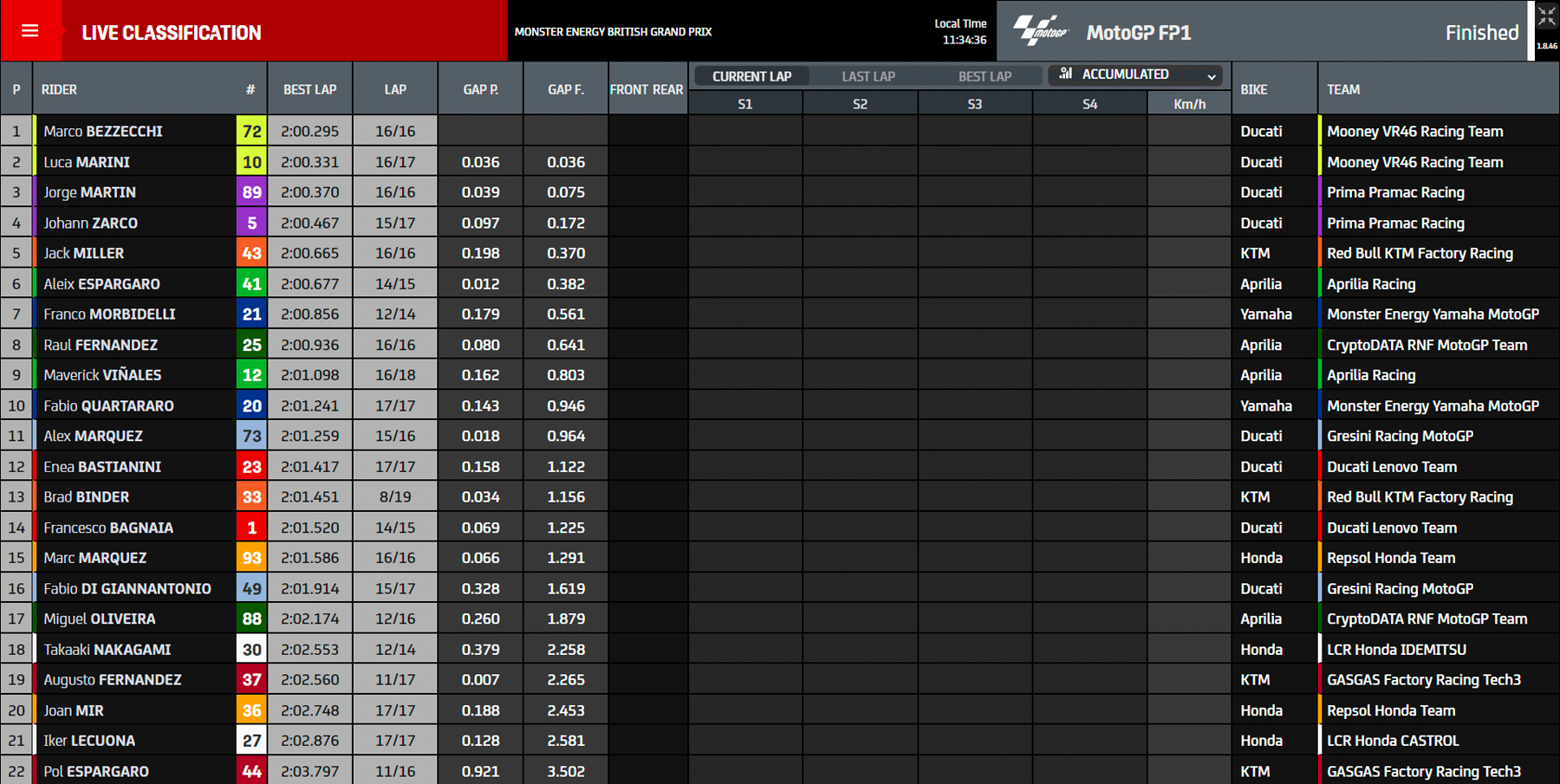 Sin embargo, los pilotos del Mooney VR46 y del Prima Pramac Racing aún no habían dicho su última palabra. Tanto Luca Marini como Marco Bezzecchi se pusieron a trabajar en equipo, dándose rueda el uno al otro, y eso les permitió dar un último golpe de riñón con el que coparon las dos primeras posiciones. El más rápido fue Bezzecchi con un tiempo de 2:00.295, superando por sólo 36 milésimas a su compañero de equipo. Muy cerca de ellos se quedó Jorge Martín, tercero a 75 milésimas. A casi dos décimas acabó Johann Zarco, que cerró el póquer de Ducati en el FP1.