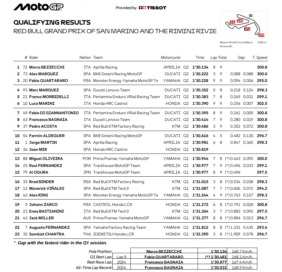 Los Márquez amenazaron con silenciar Misano llegando a ocupar las dos primeras plazas durante la Q2, pero Marco Bezzecchi fue profeta en su tierra y desbancó a Álex por sólo 88 milésimas. El 1:30.134 del piloto italiano le sirvió para llevarse su segunda pole del curso por delante de Álex, que había puesto el listón muy alto en su primera tanda con un registro de 1:30.222 hecho a la estela de su hermano.