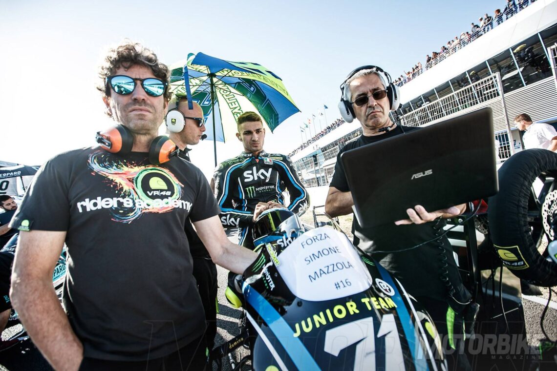El póquer de protagonistas de este reportaje lo cierra Idalio Gavira, expiloto del Mundial de 250cc y de Superbike, exdirector deportivo del Team LaGlisse y ahora coach de la VR46 Riders Academy y los 11 pilotos que engloba la “escuela” de Valentino Rossi. Palabras mayores. A grandes rasgos, ¿cuál es su función?: «Aportar mi experiencia a los pilotos con lo que veo en pista; a nivel técnico hablando con ellos, viendo telemetría, hablando con los técnicos en cuestiones de desarrollos o cambios de marchas; y también haciendo un poco de psicología de la carrera, ayudándoles con los miedos naturales que tiene cualquier piloto y tratando de ayudarles en todo lo posible durante el fin de semana».