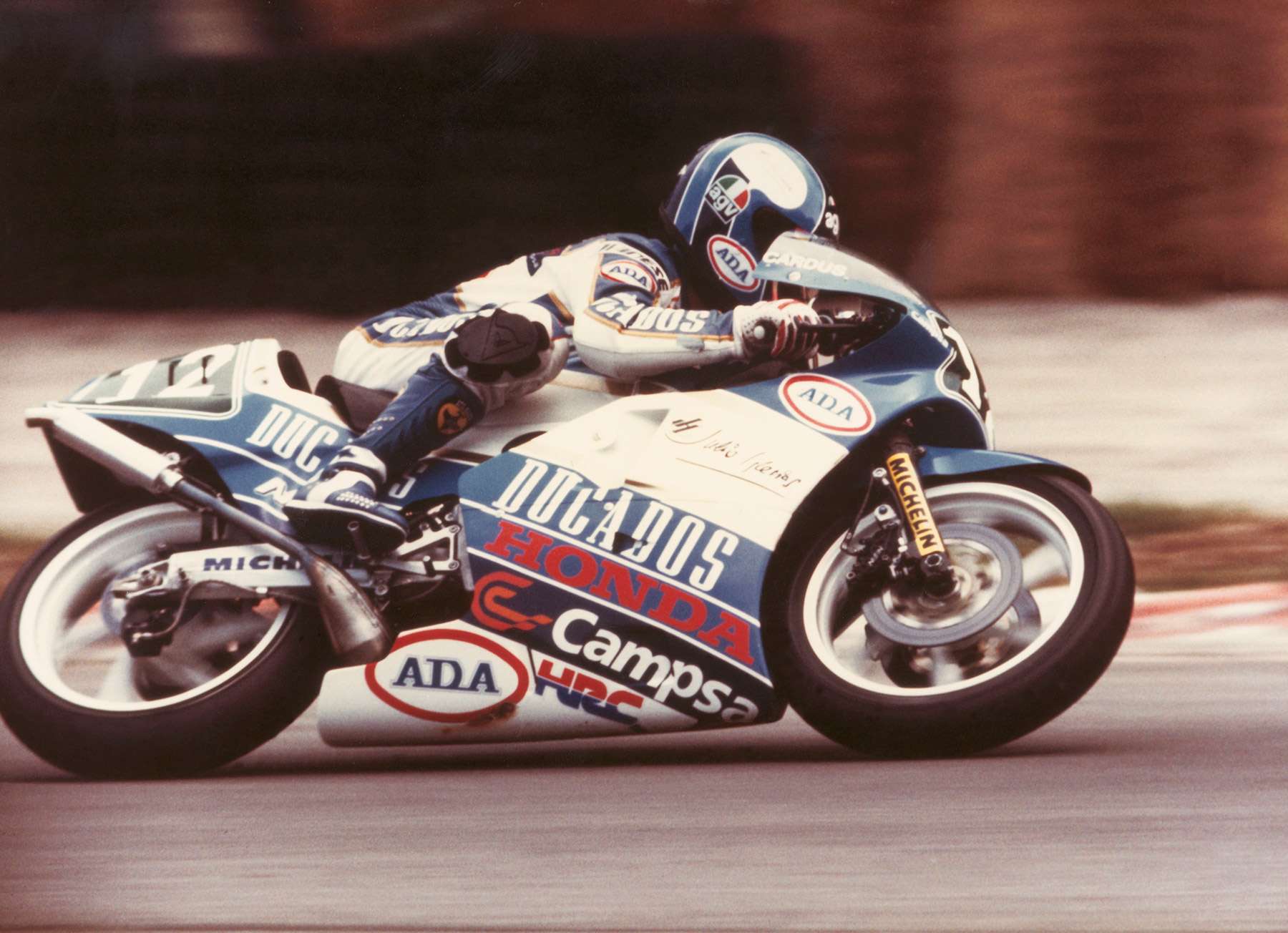 Siendo probablemente la figura más influyente del motociclismo español en aquel momento, el Team Ángel Nieto se hizo realidad en el Campeonato del Mundo de 250 cc en 1987 con Carlos Cardús como piloto sobre la codiciada Honda NSR 250 y el apoyo de Tabacalera a través de su marca de tabaco negro “Ducados”, la petrolera “Campsa” y la asociación de automovilistas “ADA”. Si creías que el fenómeno del apoyo de una “celebrity” al motociclismo había comenzado con Antonio Banderas o Paris Hilton bien entrado el siglo XXI, seguramente encontrarás bastante adelantado a su tiempo el hecho de que otro de los principales patrocinadores del equipo de Nieto era uno de los españoles más conocidos internacionalmente en la época, el cantante Julio Iglesias. «Estoy muy orgulloso de colaborar con el equipo. Ángel es un gran campeón y Cardús su mejor discípulo; es un luchador de los buenos», declaró entonces el artista a la revista semanal Motociclismo. Su firma ocupaba un lugar preferente en los laterales del carenado de la moto de Cardús.