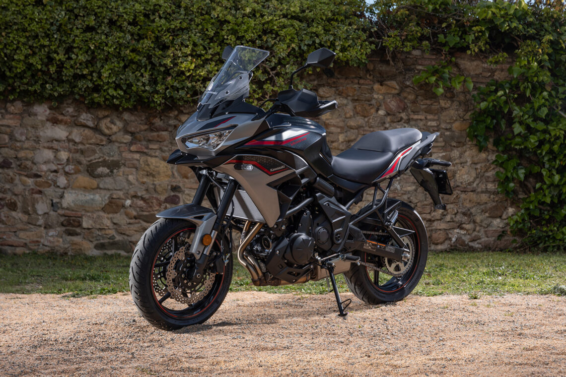 Esta trail sigue fiel a una mecánica bicilíndrica en paralelo DOHC 8 válvulas de 649 cc con 67 CV a 8.500 rpm y 61 Nm a 7.000 rpm, inyección electrónica Keihin (cuerpos de 38 mm) y embrague multidisco en aceite. La versión A2 anuncia 48 CV a 7.900 rpm y 53 Nm a a 3.800 rpm. La Versys 650 emplea un chasis tubular de acero (basculante asimétrico de aluminio) tipo diamante apoyado en una horquilla invertida Showa de 41 mm (regulable en precarga y extensión). El peso declarado en orden de marcha es de 217 kg (21 l. de gasolina).