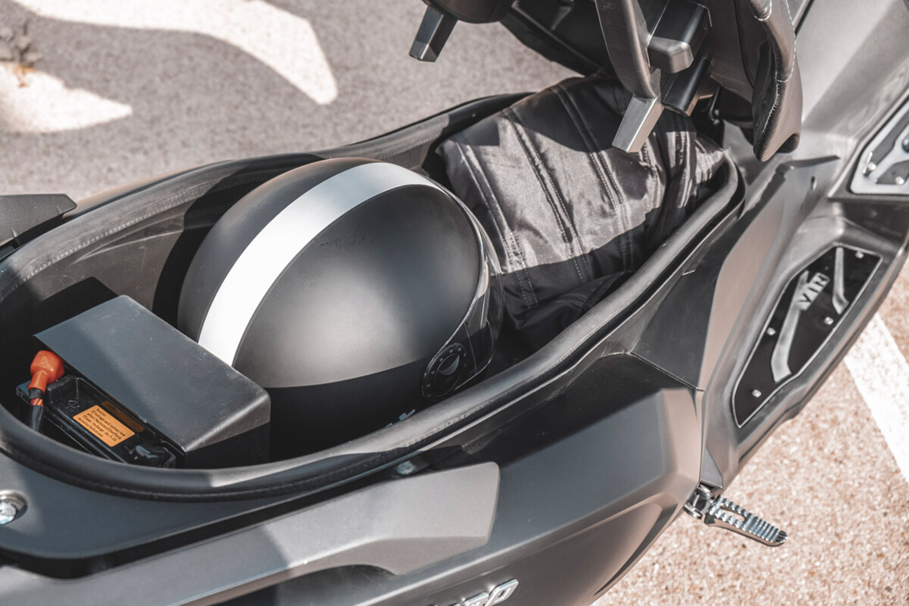 Un buen scooter no sería un buen scooter si no fuera capaz de hacernos nuestra vida más fácil y cómoda. Y para eso el 330 GTS ha sido diseñado a conciencia. Cuando sus creadores lo dibujaron sobre el papel se acordaron de incluir esos pequeños detalles que nos echan una mano en el día a día para que todo sea más sencillo. Y eso lo notamos cuando vemos que disponemos de dos guanteras y ambas con cerradura con llave, lo que siempre es una tranquilidad, y con un gran hueco bajo el asiento donde cabe un casco integral y varias cosas más, incluso una mochila o un casco jet si no es muy grande.