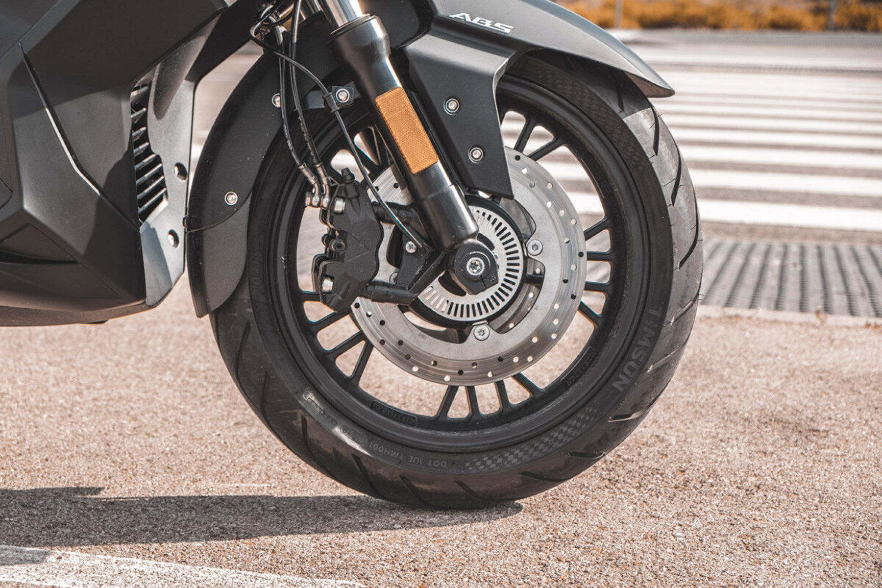 Y por otro lado, la frenada se merece una mención aparte. A pesar del contenido precio del Mitt 330 GTS, en el tren delantero encontramos dos discos mordidos por pinzas radiales de 4 pistones, lo que permite una frenada potente y segura. Este equipo, ahí donde lo ves, es equiparable al de una moto deportiva moderna, con la ventaja además de que el 330 GTS pesa solo 165 kilos en vacío. Como la horquilla tiene un tarado tirando a firme aguanta bien las frenadas más fuertes, por lo que podemos sacarle todo el partido a ese doble disco delantero. Cómo no, tanto esos discos como el trasero cuentan con sistema ABS para incrementar nuestra seguridad.