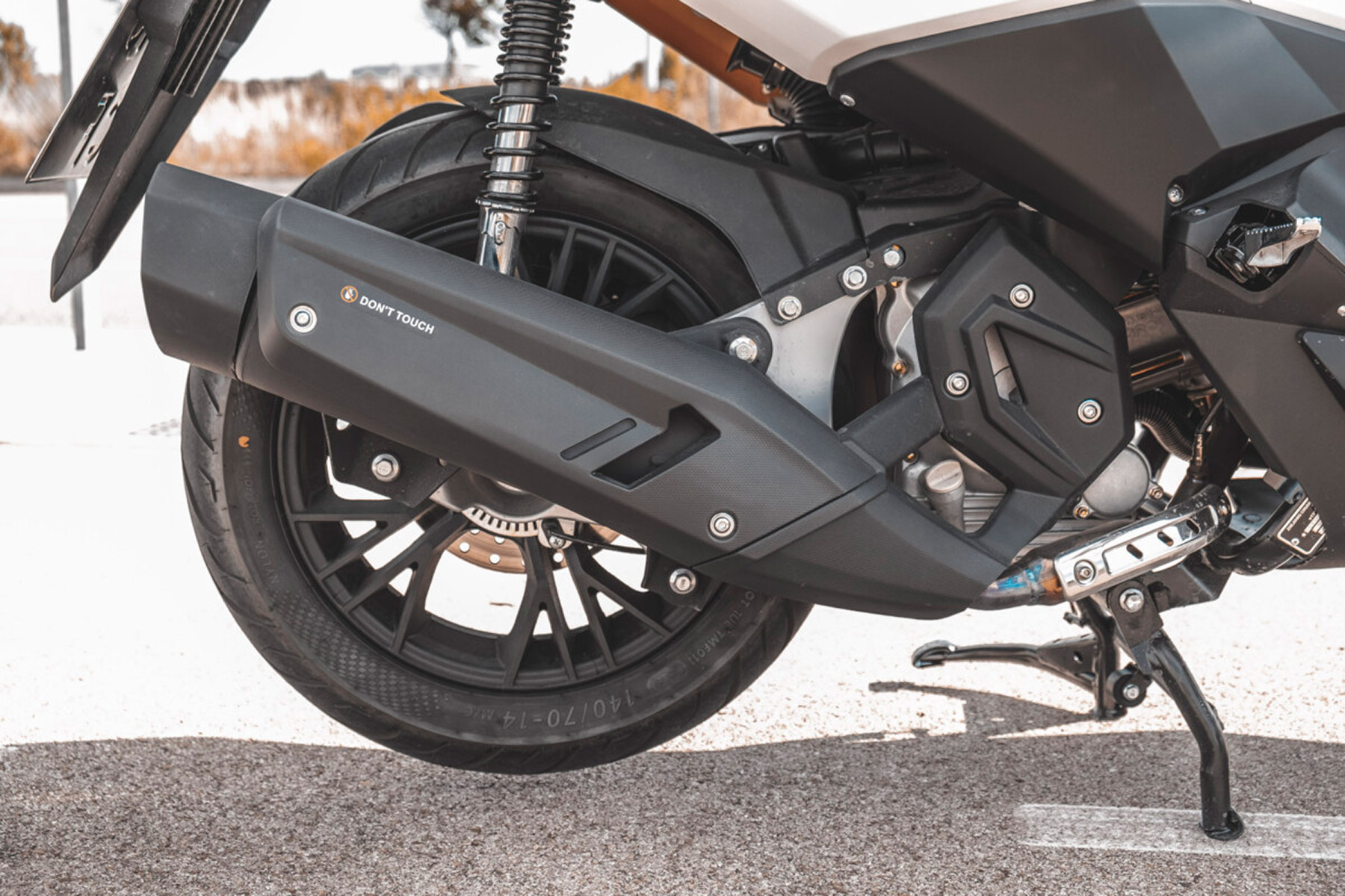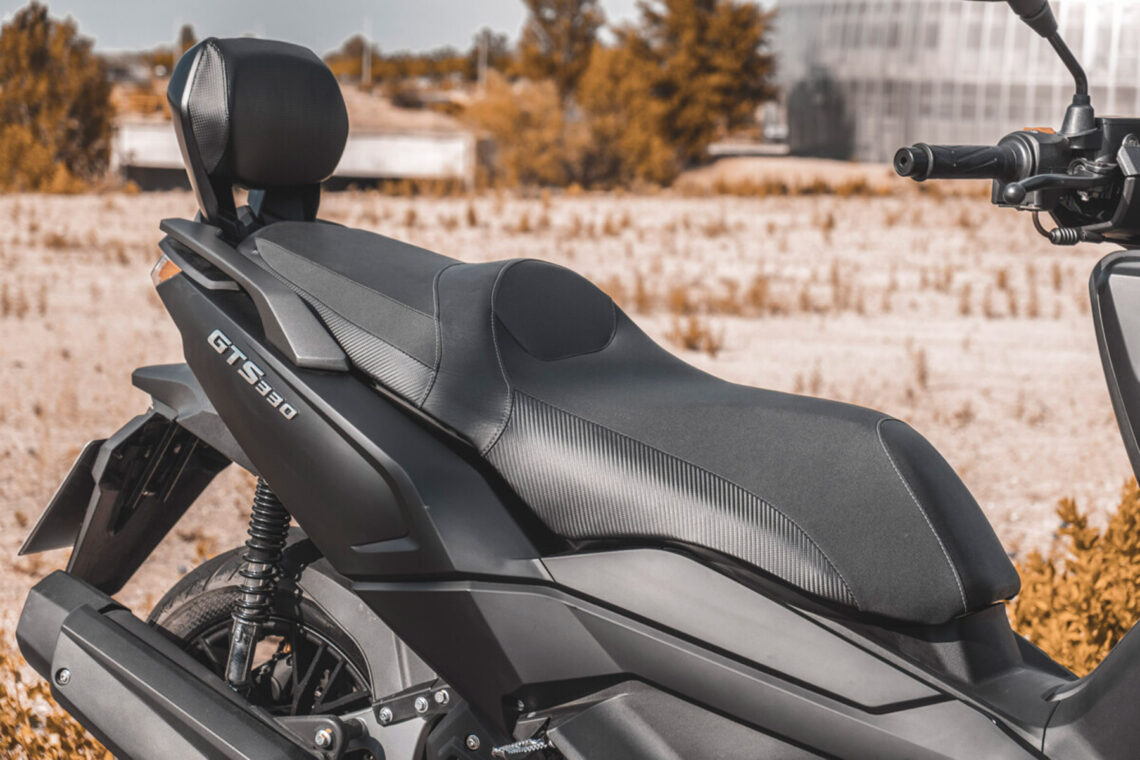 Pero además, también estamos ante un scooter rápido, tanto en aceleración, crucial en ciudad, como en punta, básico en carretera abierta. Aunque de eso te hablaremos un poco más abajo, porque aquí no queremos dejar pasar su ergonomía. El 330 GTS de Mitt está bien pensado para pasar kilómetros sobre él, pues a la vez que el conductor cuenta con un espacio generoso y confortable, incluso si se es de talla grande, el pasajero está especialmente bien cuidado. Tiene respaldo para él, lo que siempre transmite confort y tranquilidad, y también estribos retráctiles, por lo que una vez desplegados la comodidad está garantizada.
