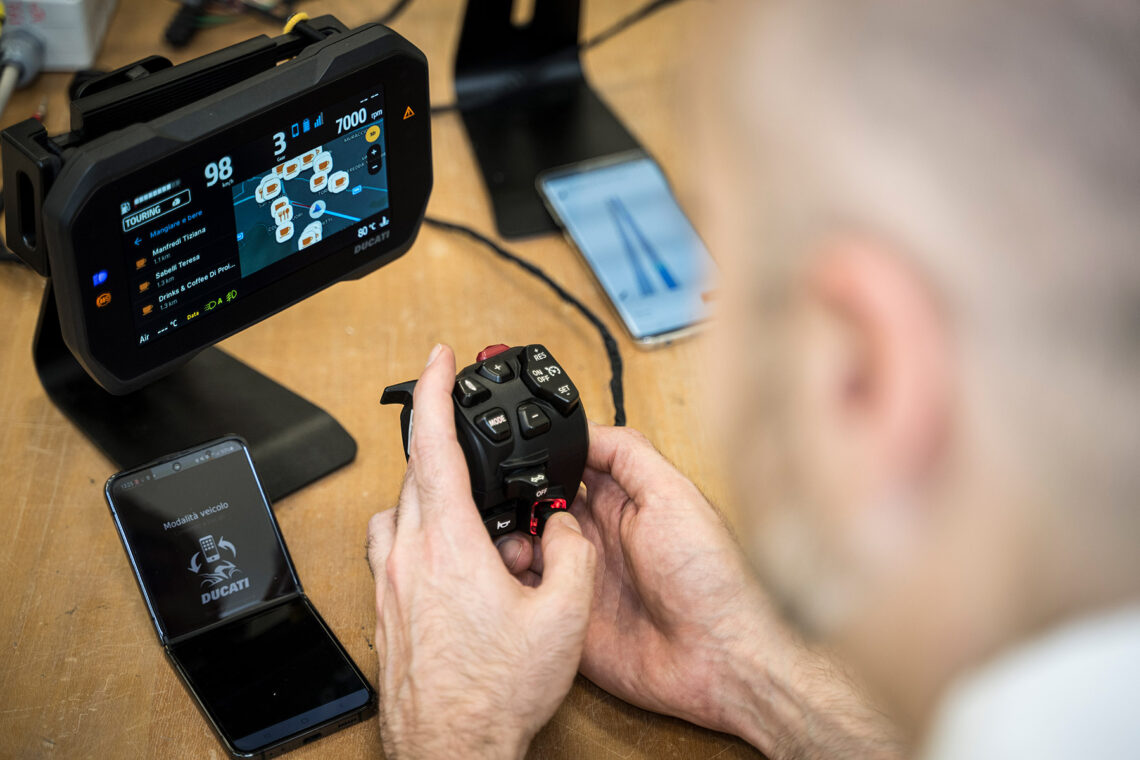 Es este departamento el que también se encarga de la depuración y actualización de las aplicaciones móviles, en un momento en el que la conectividad cada vez tiene mayor protagonismo en la motocicleta. Dado el gran número de marcas o distintos sistemas operativos con sus respectivas actualizaciones, es un valor añadido tener a un grupo de personas dedicadas a este aspecto para tener todo al día. Un ejemplo es el sistema de navegación: la solución Phone Mirroring, que permite transformar el panel de instrumentos en un navegador de mapas a color con toda la información (Multistrada V4) o el sistema Turn-by-Turn de la DesertX y Diavel V4 de 2023, que permiten no estar esclavizados a un solo sistema operativo sino que permite la compatibilidad tanto con iOS como con Android además de la evolución continua del software que luego se actualiza de forma gratuita para los clientes.