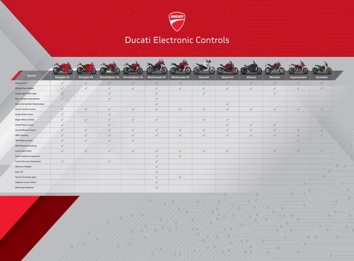 El criterio ha sido el de crear motos seguras, potentes y accesibles y por eso el desarrollo ha ido ligado a dotar de soluciones que finalmente hayan resultado en un catálogo en el que cada modelo es una referencia tecnológica del segmento. Con este afán, Ducati ha logrado que toda su gama actual venga ya equipada de serie con ABS en curva y control de tracción.