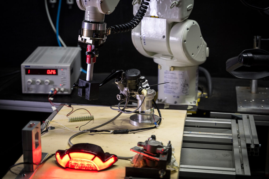 El personal altamente especializado del laboratorio de Electrical & Electronic Testing también realiza la verificación del funcionamiento de los componentes en condiciones térmicas y ambientales extremas, que se hace posible gracias al uso de celdas capaces de replicar temperaturas que van desde –40°C a 180°C y eventos atmosféricos como fuertes lluvias o niebla salina. Los componentes también se someten a esfuerzos mediante robots que repiten operaciones miles de veces, como, por ejemplo, el giro del manillar para comprobar la correcta fiabilidad del cableado, u otras operaciones como la maneta de freno para encender la luz de freno, verificando su valía en condiciones reales de uso. Dentro del laboratorio se puede controlar cada chip de manera individual, pudiendo seleccionarlos para analizarlos al microscopio y verificar su composición exacta según las especificaciones de desarrollo
