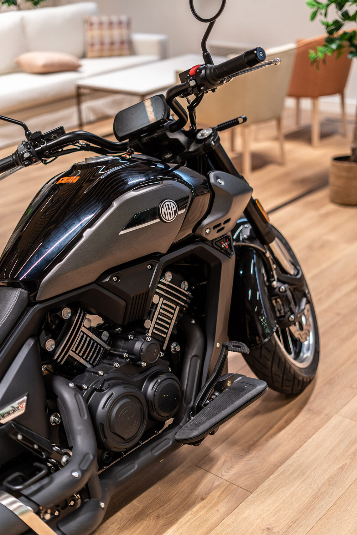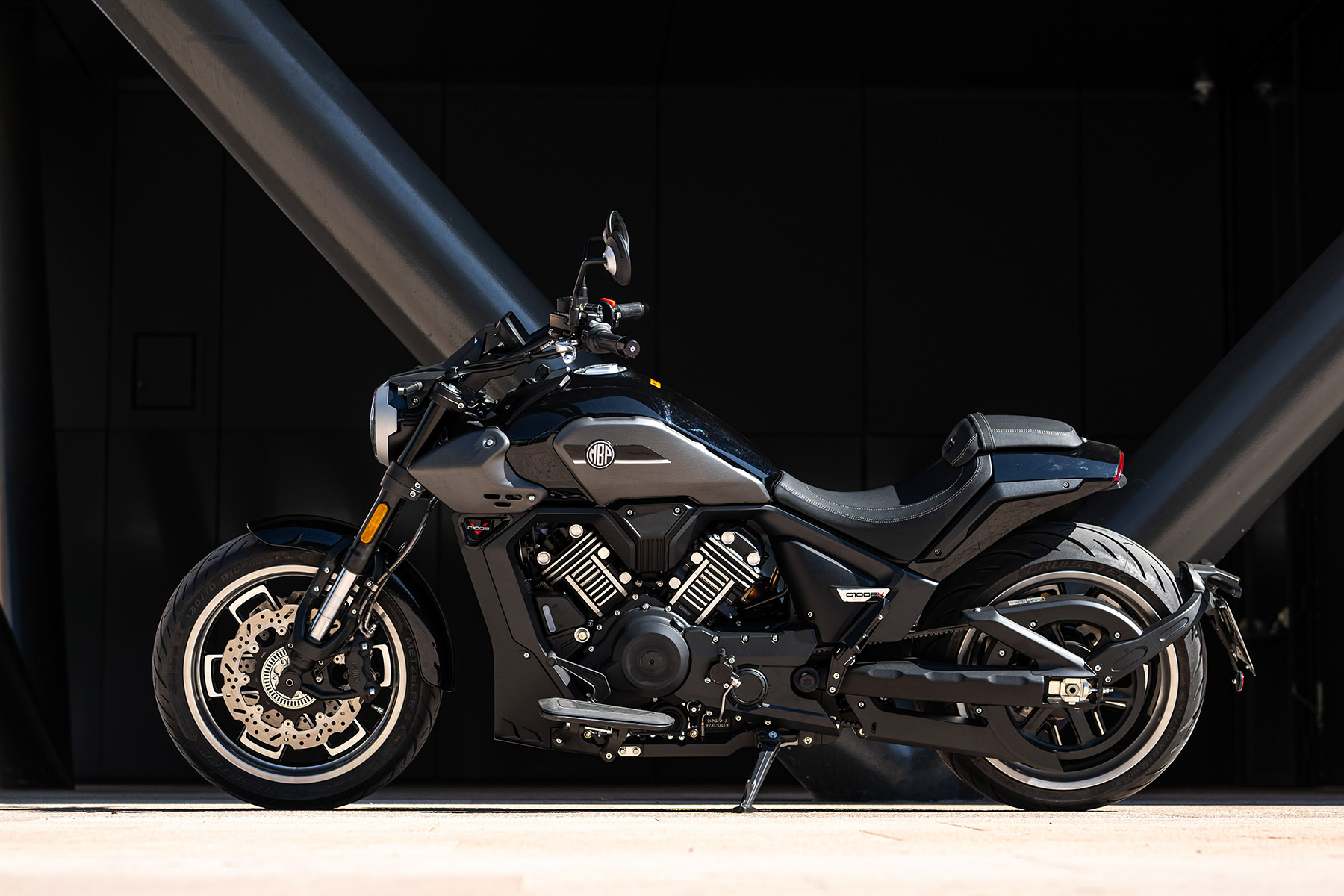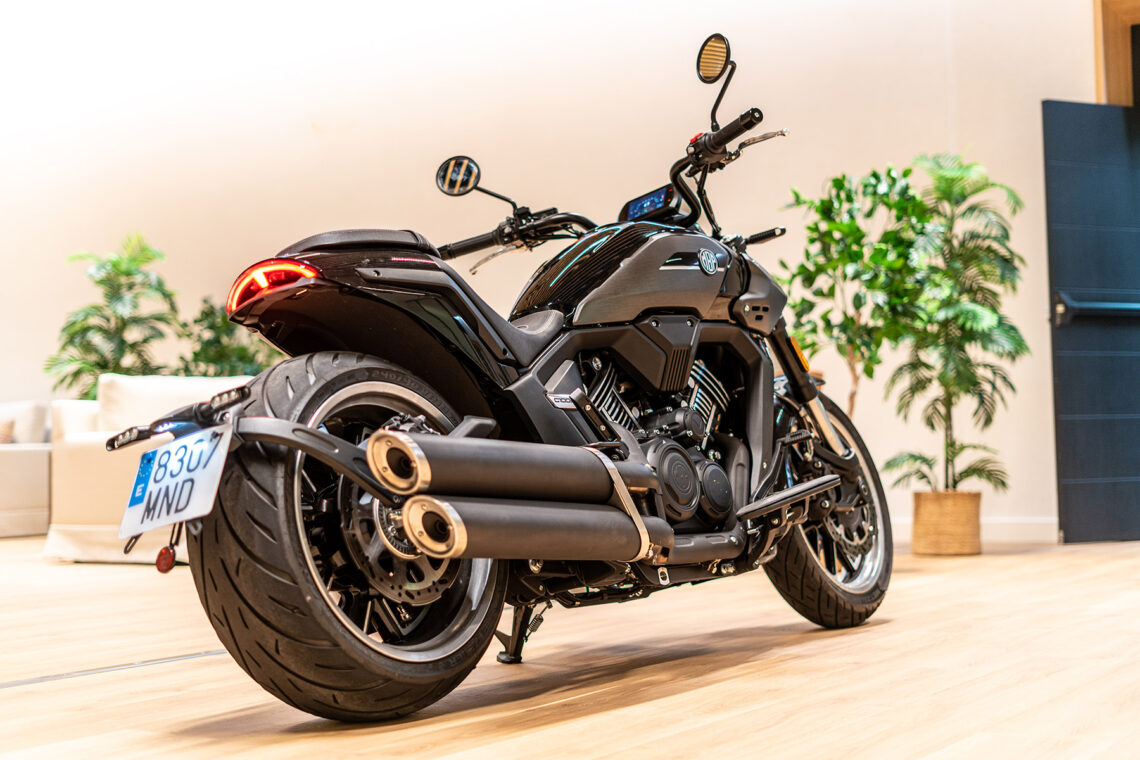 Como mandan los cánones custom, la Morbidelli MBP C1002V emplea un motor V-twin SOHC 8 válvulas refrigerado por agua con 997 cc, 88.4 CV a 7.200 rpm y 89 Nm a 5.250 rpm, embrague antirrebote, transmisión secundaria por correa dentada e inyección Bosch.