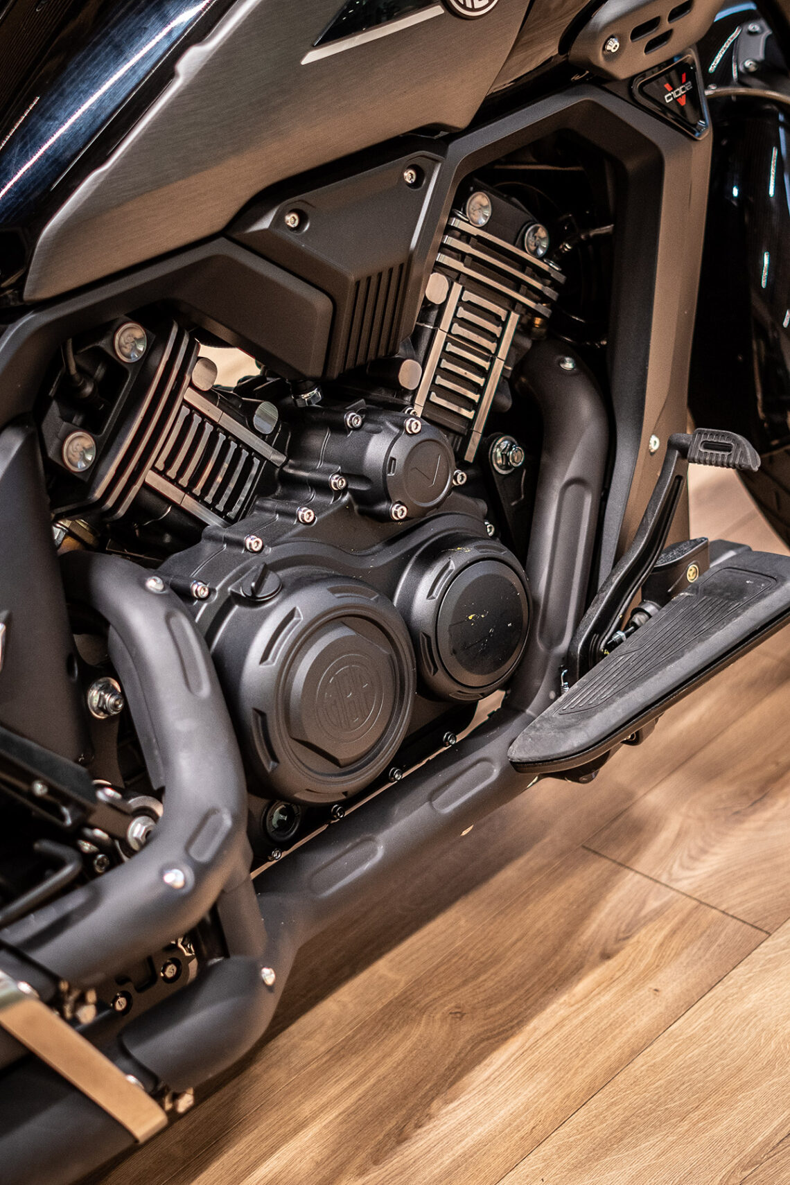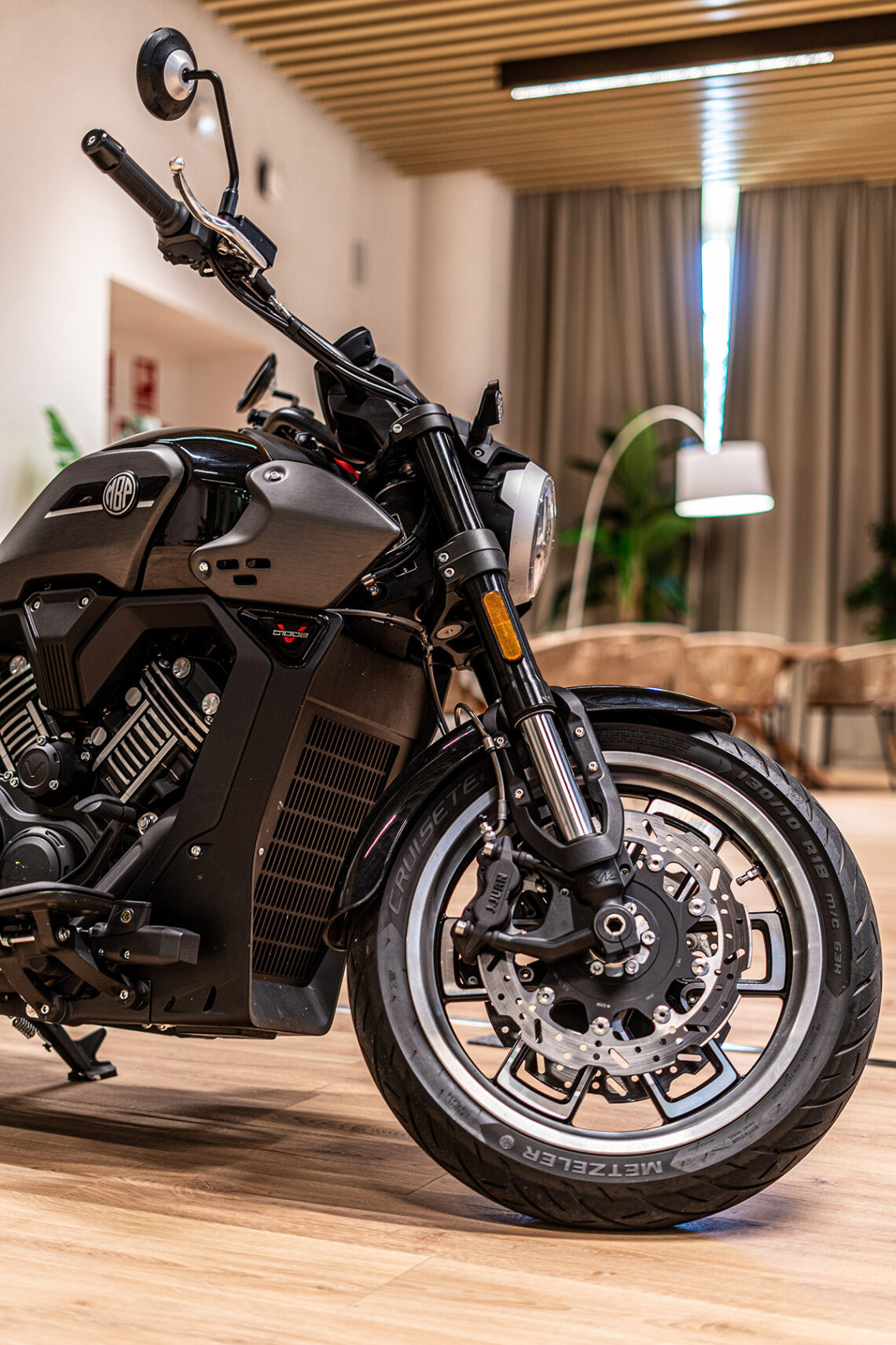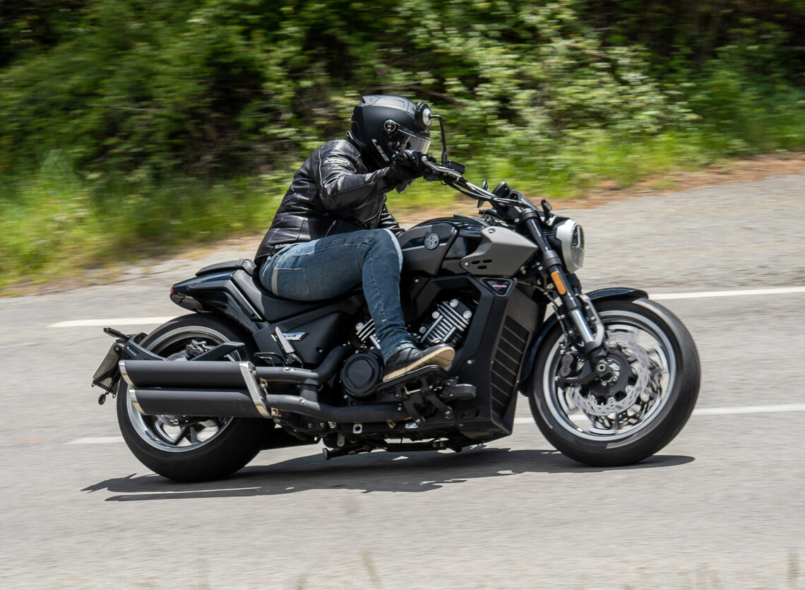 Como mandan los cánones custom, la Morbidelli MBP C1002V emplea un motor V-twin SOHC 8 válvulas refrigerado por agua con 997 cc, 88.4 CV a 7.200 rpm y 89 Nm a 5.250 rpm, embrague antirrebote, transmisión secundaria por correa dentada e inyección Bosch.