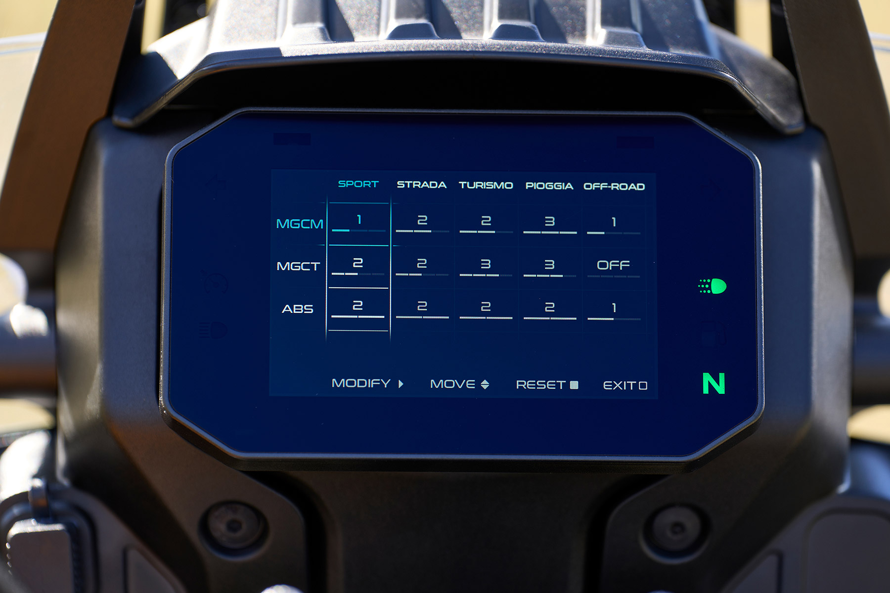 - IMU, 5 modos de conducción, control de tracción/ABS en curva, control de freno motor, constrol de velocidad.
