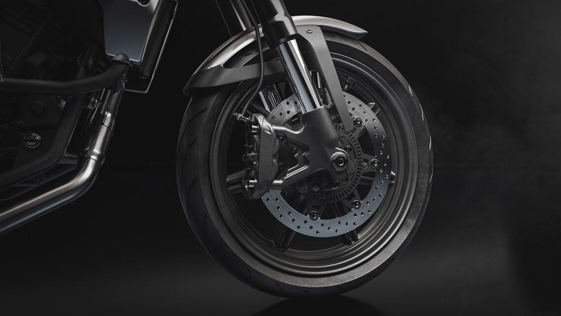 En la parte ciclo, encontramos suspensiones muy decentes, con una horquilla invertida delante de 43 mm y 120 mm de recorrido, el mismo que en el monoamortiguador trasero, éste ajustable en precarga. Para la frenada, se sirve de un disco delantero de 300 mm con pinza de anclaje radial de 4 pistones y otro disco trasero de 255 mm. Sus llantas de aleación y rueda de 17" en ambos ejes nos insinúan claramente su vocación asfáltica y deportiva.