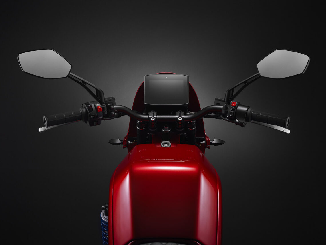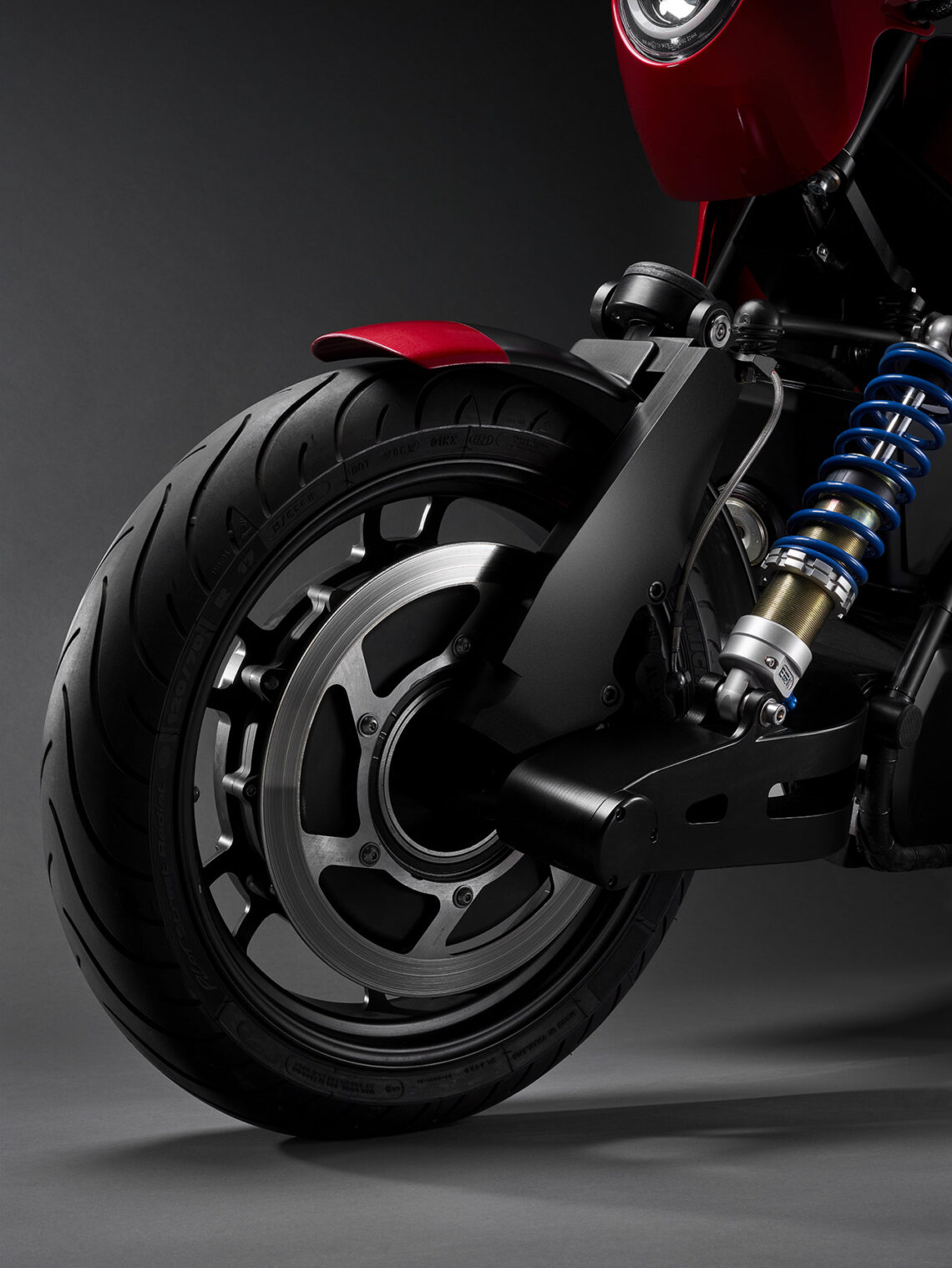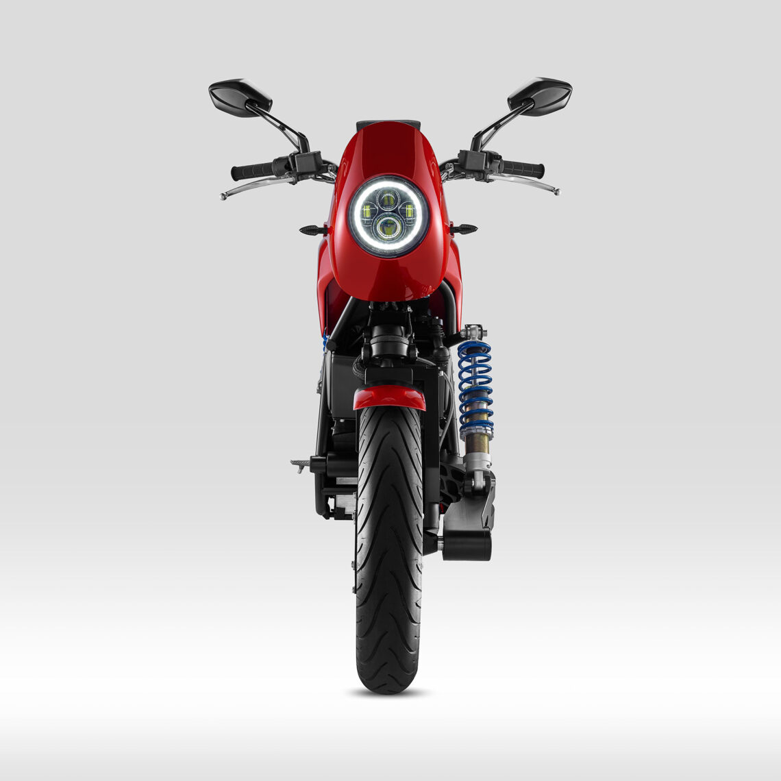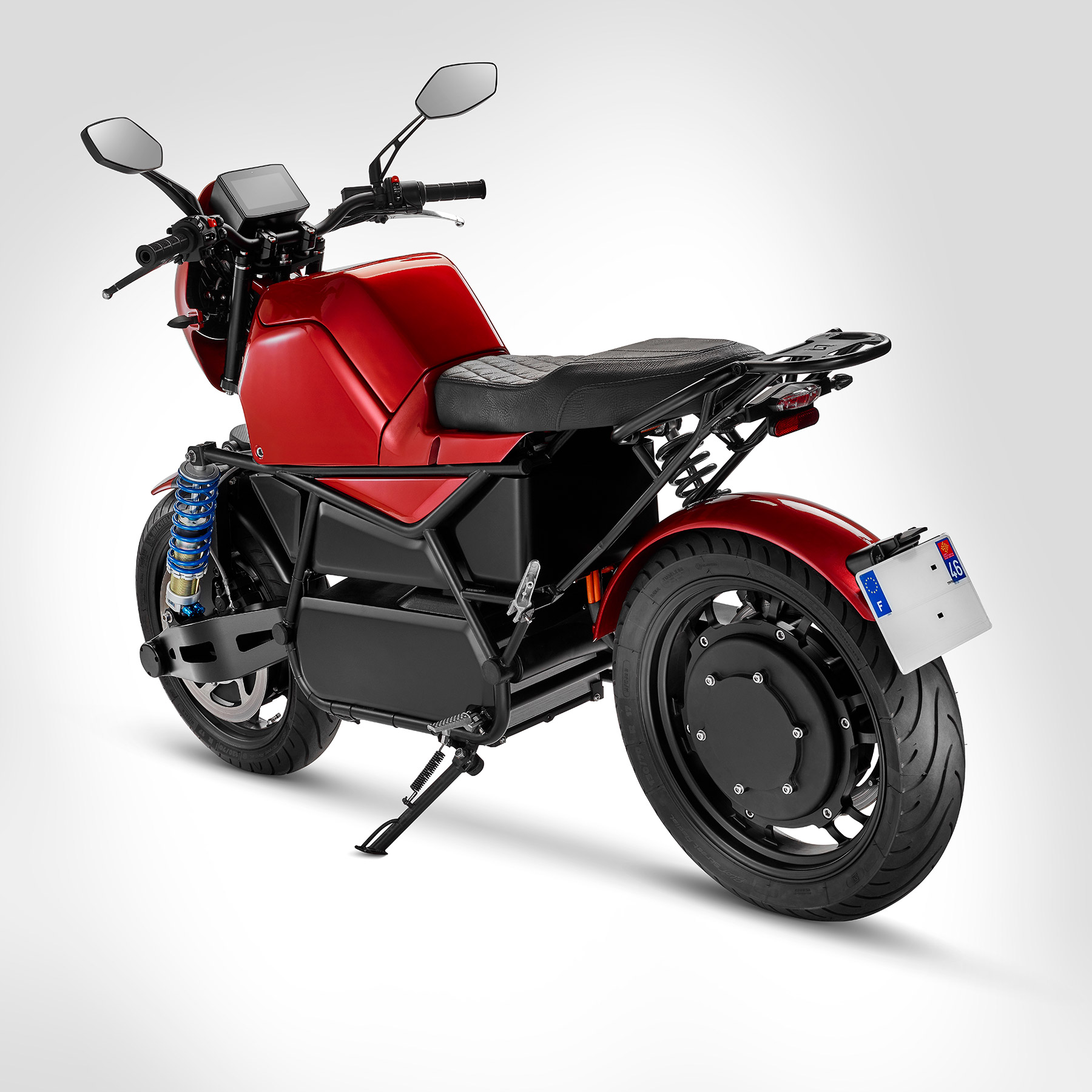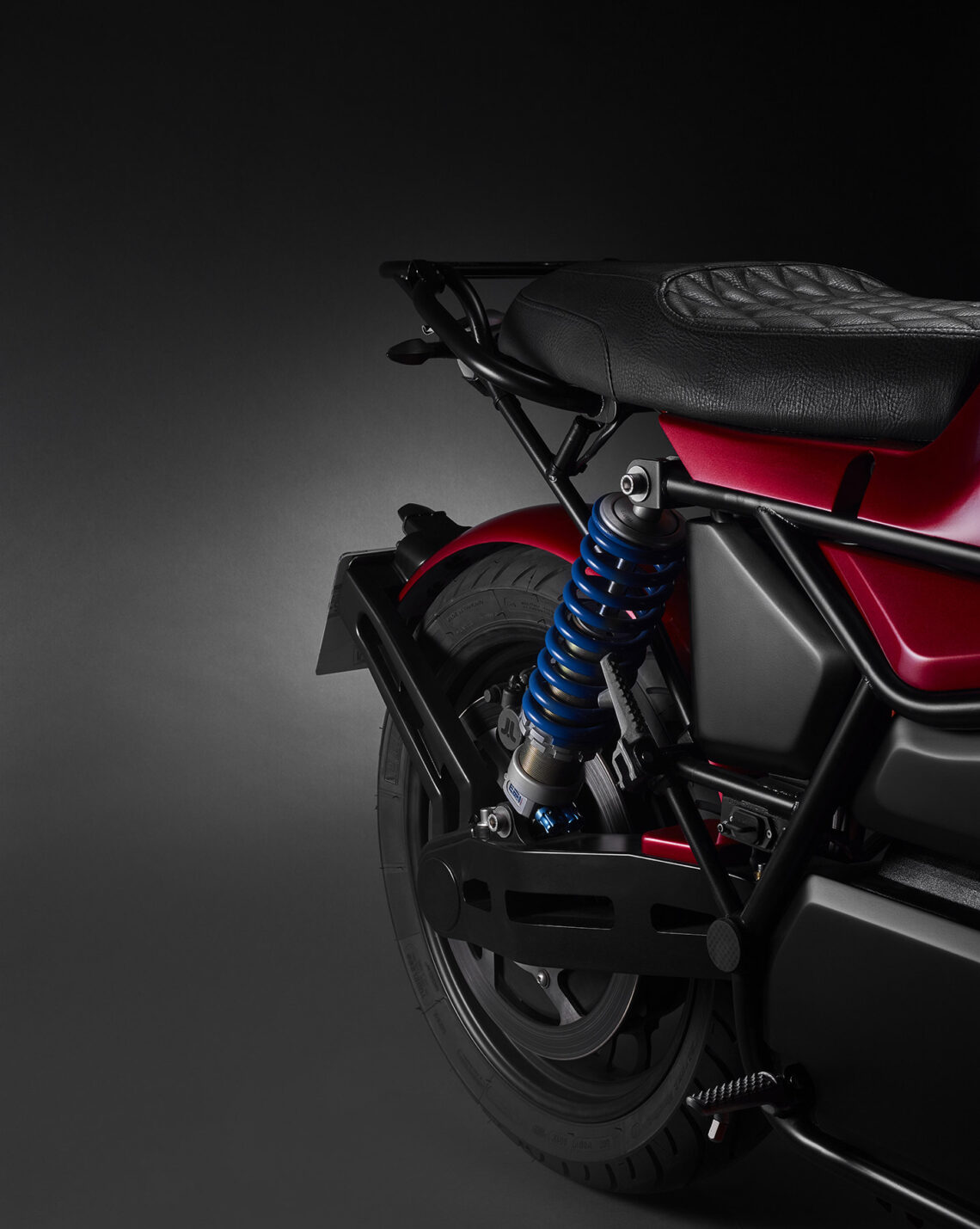 Eso sí, no hace falta que la marca nos dé muchos más detalles para ver que estamos ante una moto eléctrica 125 diferente a todas las demás. Dentro de lo que cabe, el bastidor tubular de acero se podría considerar algo dentro de lo normal, pero lo que llama la atención es que opta por una dirección alternativa basada en un basculante monobrazo, al igual que lo hace con la rueda trasera. Siendo mantenida la rueda delantera por la izquierda y la trasera por la derecha. Los neumáticos, por su parte, son de medidas 120/70-17” delante y 130/70-17” detrás.