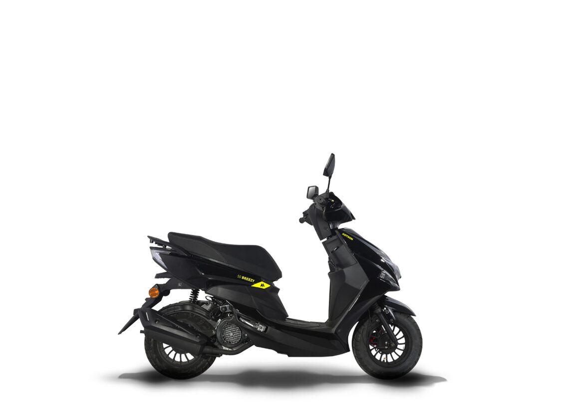 El Breezy 50 es un scooter creado para aquellos que se inician en las dos ruedas y buscan dejar atrás los desplazamientos en transporte colectivo. Cuenta con arranque eléctrico y un motor monocilíndrico de 50 cc y cuatro tiempos refrigerado por aire. Tiene un rendimiento máximo de 3 CV a 8.000 rpm de potencia y un par motor de 2,6 Nm a 7.500 rpm, consume 2,2 litros por cada 100 y ofrece una autonomía de más de 200 km. Su precio es de 1.299 € (IVA incluido) y está disponible en los colores Carbon black matt o Rock grey matt, combinado con detalles en verde flúor.