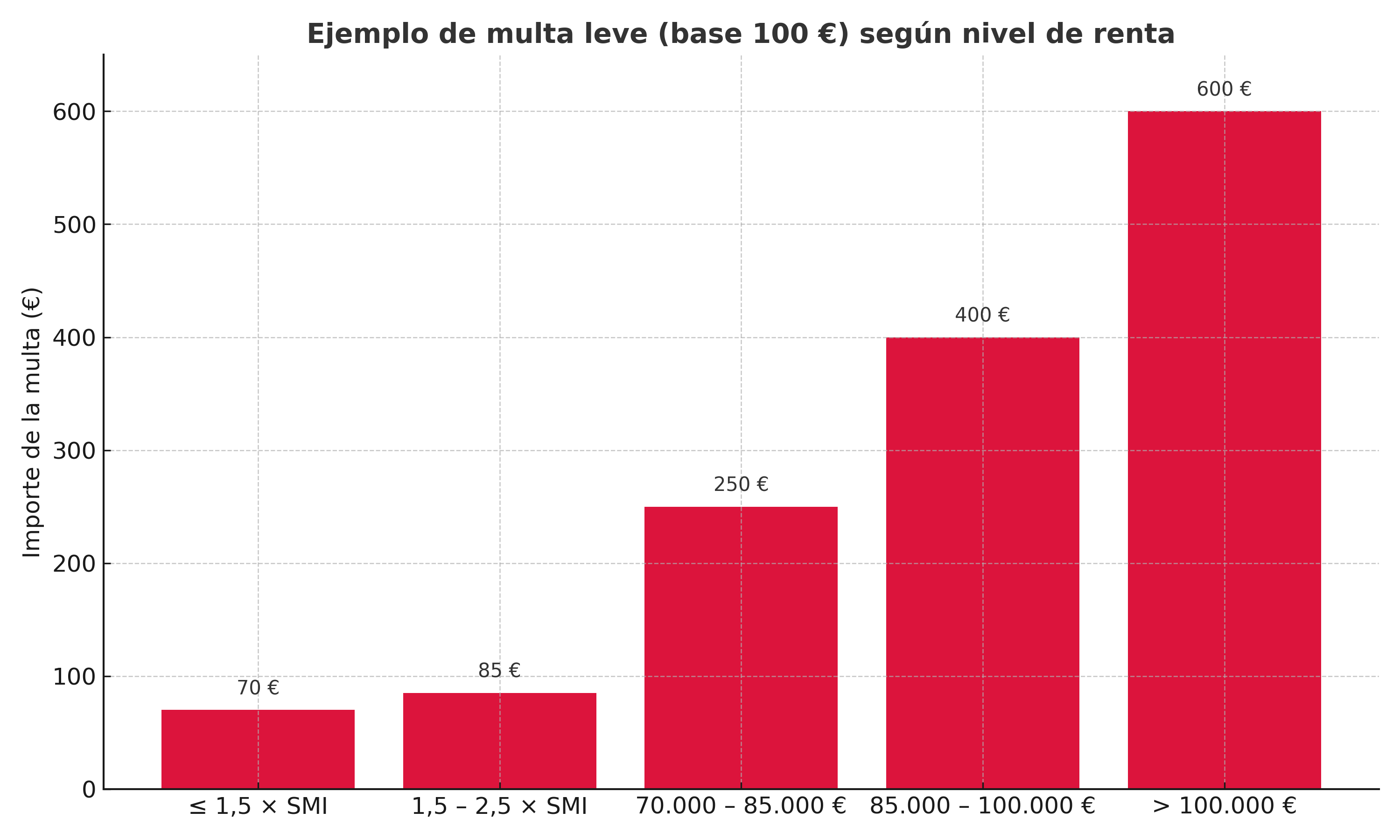 Además, la misma lógica se aplicaría a las infracciones graves o muy graves. Por ejemplo, una sanción de 200 euros podría bajar hasta 140 euros para rentas bajas, o subir hasta 1.000 euros si el infractor supera los 100.000 euros brutos al año.