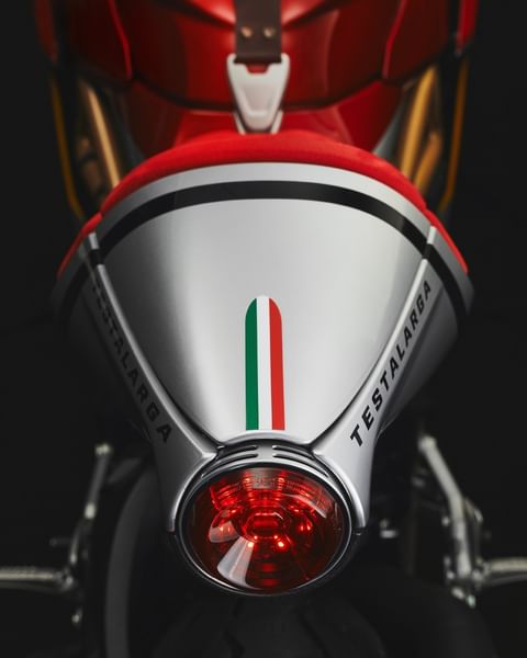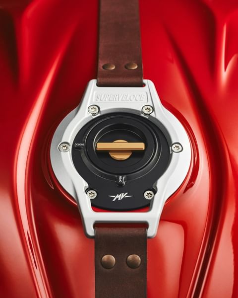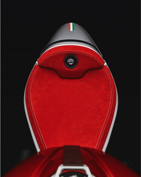 La marca italiana ha dejado caer en sus redes sociales un par de menciones (Instagram y Facebook) en las que nos enseñan algunos detalles de la MV Agusta Superveloce Testalarga. Para empezar, un asiento tapizado ante rojo perforado. También vemos parte del carenado, que parece también agujereado, y varias perspectivas siempre desde atrás en las que adivinamos los colores del nuevo esquema de color (rojo, gris y dorado) o el dorsal número 3 además de llantas doradas. No falta la tricolor italiana en la tapa del colín, en cuyo lateral leemos el nombre de esta edición especial. En otra instantánea, vemos la tapa del depósito, en dorado.