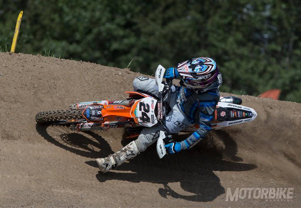 La exhibición de Shaun Simpson ha sido de las que crean afición por dos cosas: por su condición de privado peleando con los oficiales, y por la determinación con la que ha ganado el GP, aparte de su exquisito estilo sobre la arena belga. El Holeshot era para Romain Febvre pero Simpson no tardó en disputarle la posición. Con Shaun ya en cabeza, Febvre se situaba paralelo a la KTM del británico cuando sufría una caída mientras mantenía el mano a mano. Paulin se hacía con el segundo puesto que dejaba Febvre, e incluso más tarde el líder de la general terminaría por los suelos de nuevo. El orden de entrada a meta: Simpson, Paulin y Febvre. El privado le había plantado cara a la sensación de 2015, y de qué manera.