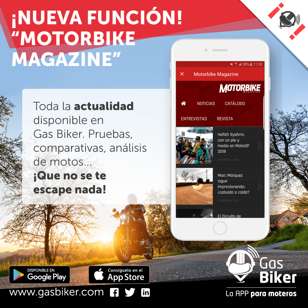 Como lo lees, Motorbike Magazine es una de las novedades de Gas Biker. La app consta ahora de un un nuevo panel de noticias a través del cual se accede a la información actualizada de nuestro medio de comunicación. De esta manera, el usuario de Gas Biker puede leer fácil y rápidamente la actualidad y las últimas novedades del mundo de las dos ruedas.