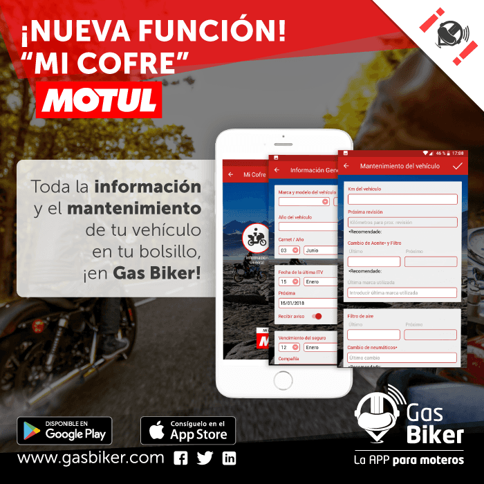 Gracias a la colaboración con Motul, tendrás en la app un apartado denominado Mi Cofre Motul en el que podrás llevar la cuenta sobre el mantenimiento de la moto como saber cuándo toca el cambio líquidos como aceite y filtro, filtro del aire, mantenimiento del kit de arrastre, etc. En esta sección se pueden añadir avisos automáticos para que nos avise cuando se acerque la fecha de la próxima ITV y el vencimiento del seguro.