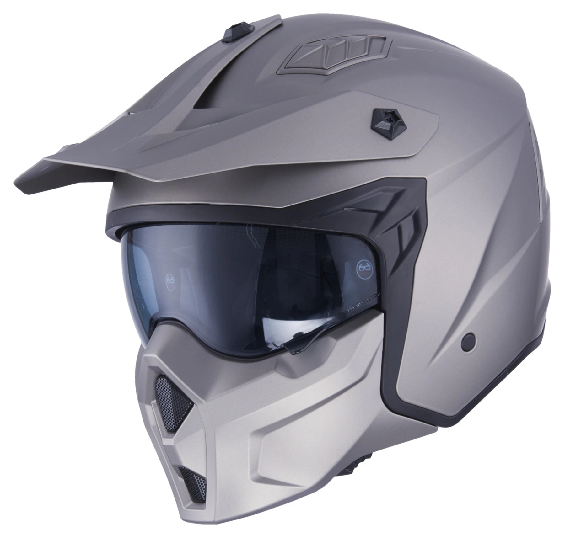 Aventurero, pero con mentonera desmontable para convertirse en un casco jet, tipo trial, y con visera igualmente desmontable para ser un jet normal. Robusto, cómodo y preparado para terrenos variados, este casco está hecho para los que no se conforman con lo básico y buscan una opción de diseño agresivo.