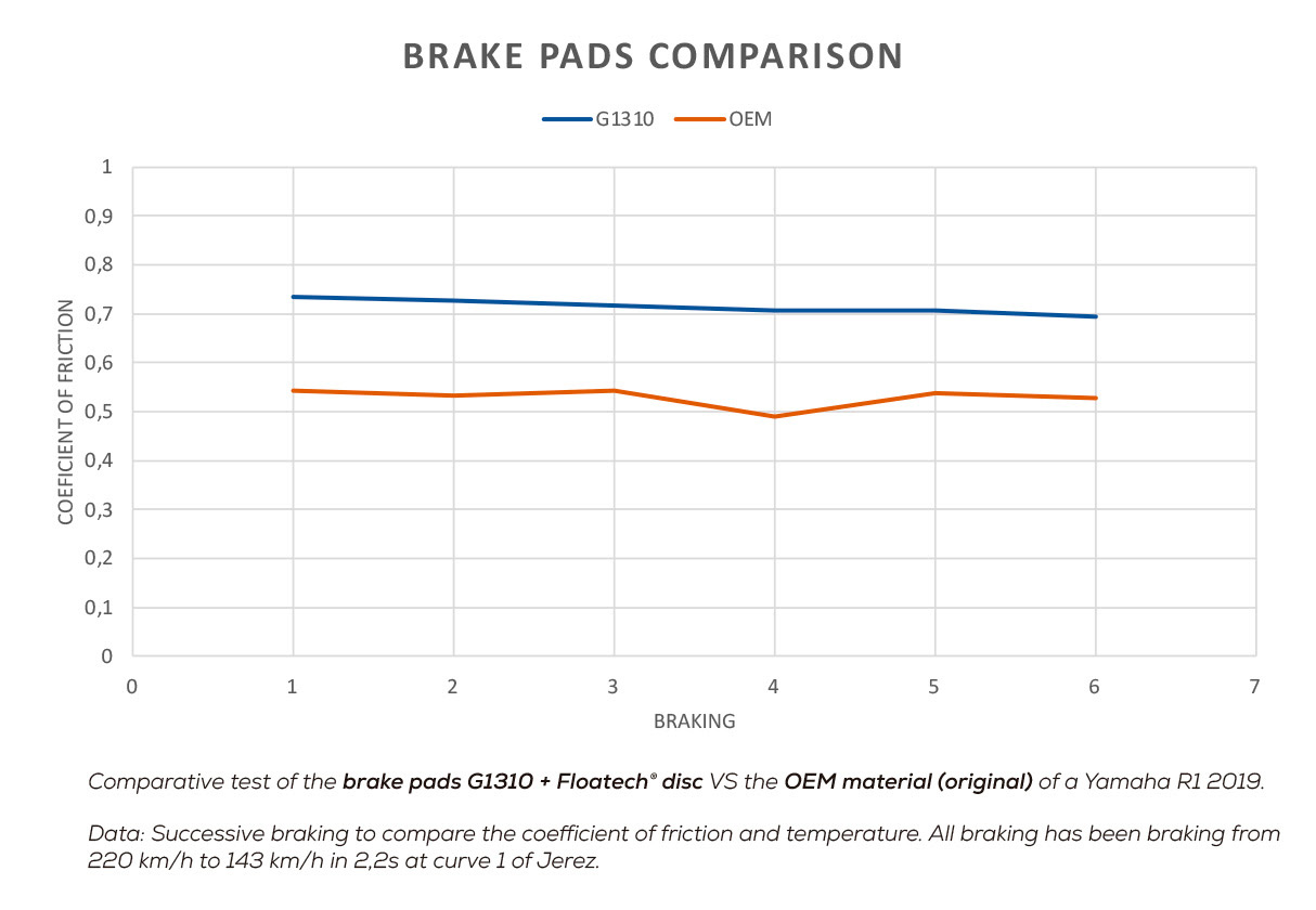 Ciertamente el tacto de la frenada se volvió más crítico, y en caliente, tras varias vueltas, puedes descubrir una frenada un tanto agresiva. La progresividad presente en las frenadas de la R1 ya no es la misma, sin embargo, sigue siendo modulable, a otra escala, pero ¡sigue siéndolo! Esto es algo que no pueden decirlo todas las pastillas. Seguramente haya alguna pastilla más progresiva, pero desde luego no ofrece el rendimiento encontrado en motos de alta cilindrada, en alta temperatura, ni en condiciones frías. Debo reconocer que la pastilla de freno G1310 logra abarcar muchísimo apretando bastante.
